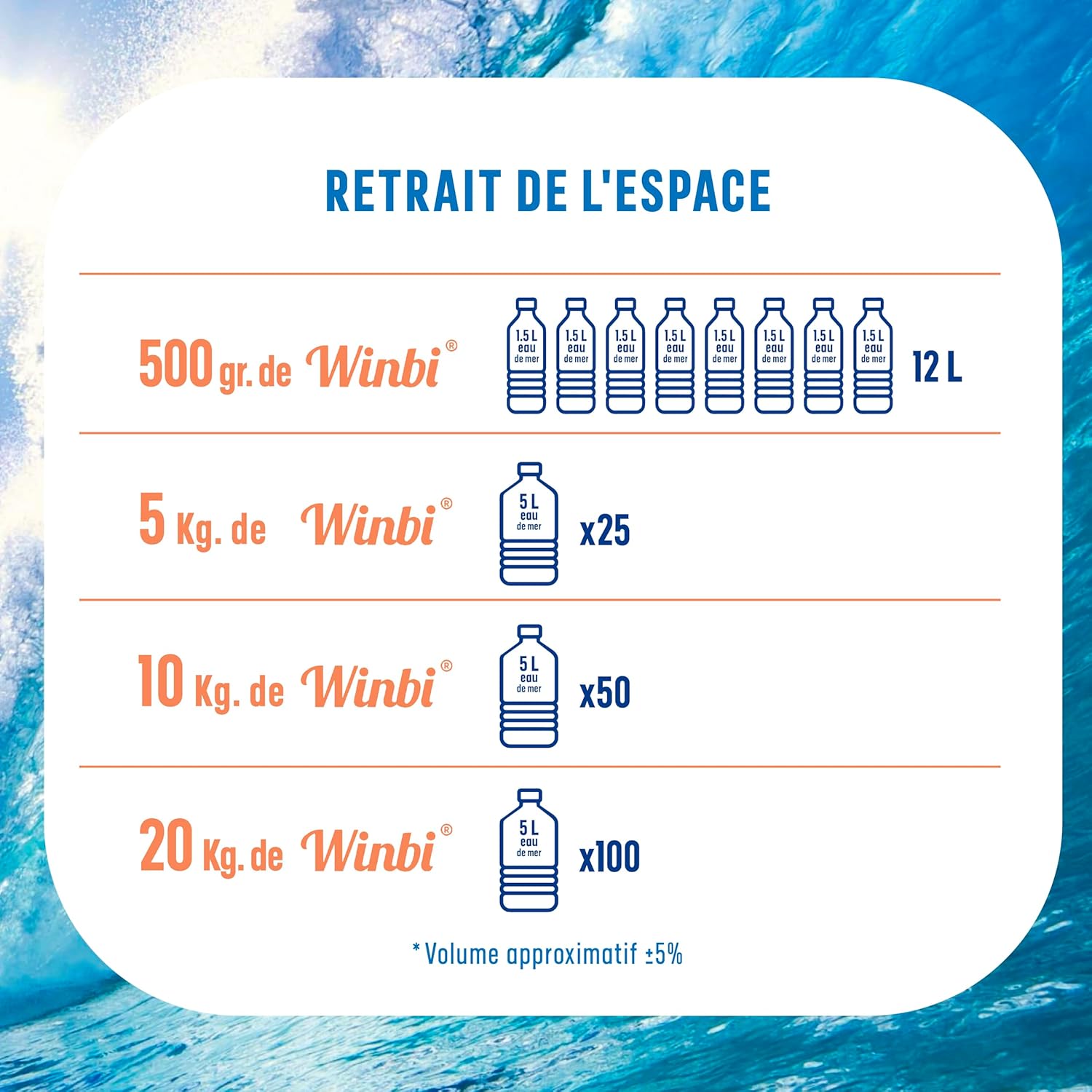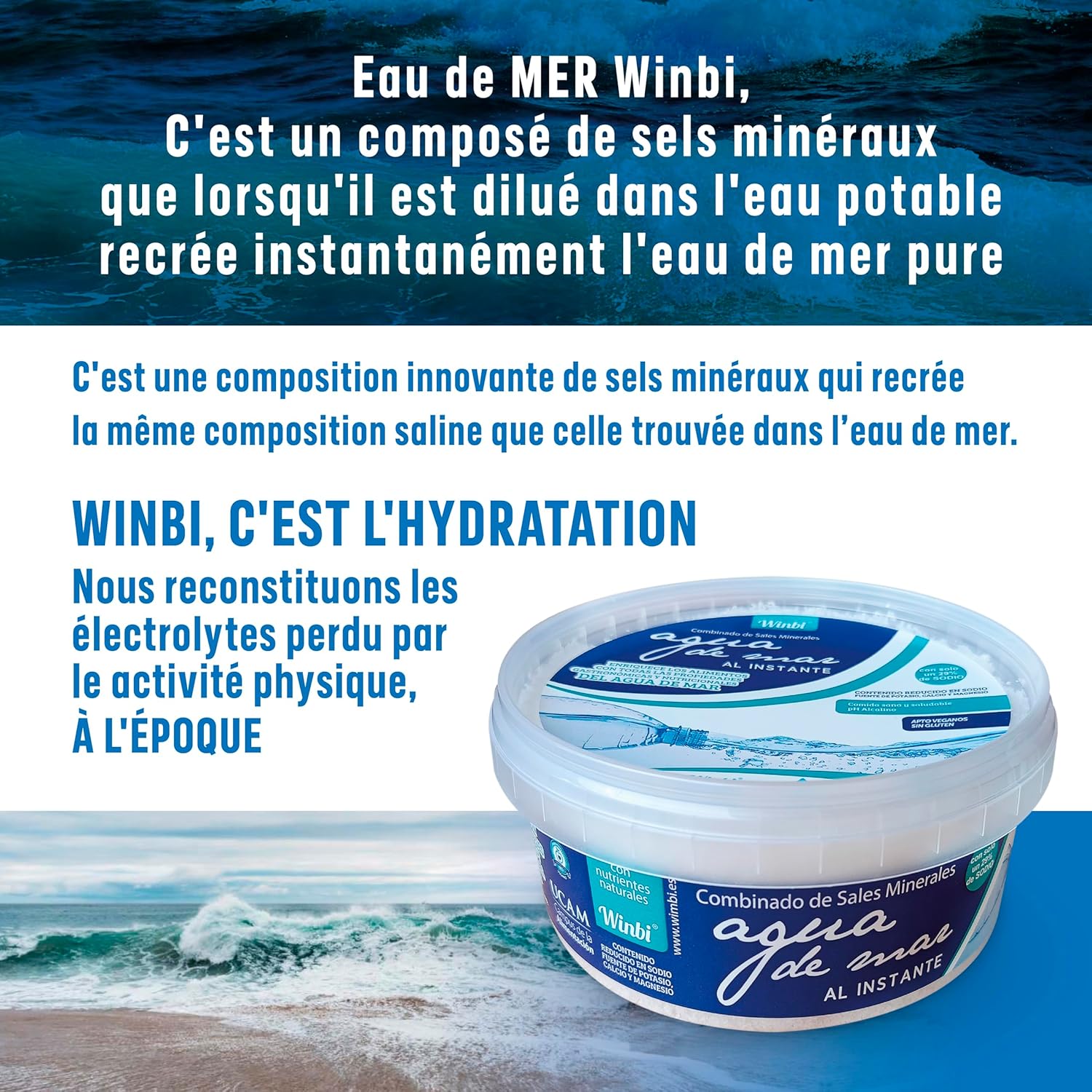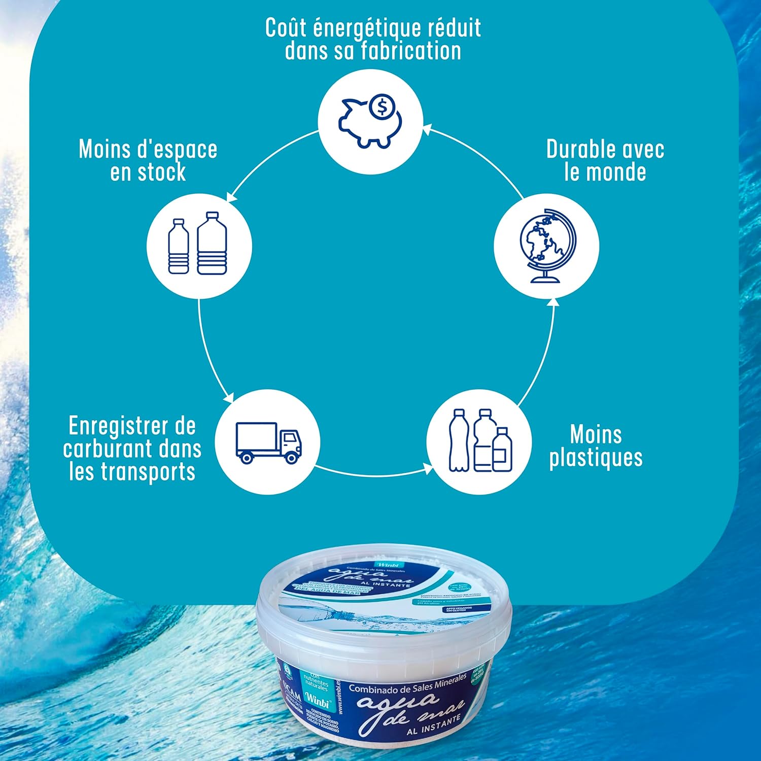 [SEAWATER]: Winbi presents an innovative solution. At only 500 g it is possible to create 12.5 litres of pure sea water. The effectiveness and concentration of the product not only optimizes its use, but also offers a more sustainable and practical alternative to those who seek to enjoy the benefits of seawater in a practical and environmentally friendly way.