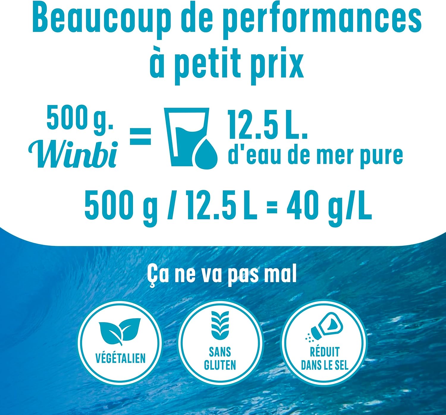 [TO DRINK]: The typical proportion of one part sea water and three parts of fresh water to obtain drinking sea water is summed up in that, with 500Gr of Winbi, it is possible to create 50 liters of ready-to-drink seawater. (10 g per litre of drinking water). Isotonic drink. Vegan and gluten free.