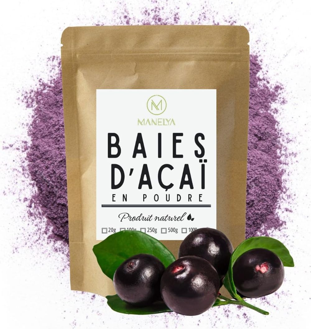 Stock up on energy and antioxidants with this pure and natural Acai powder. Made from acai berries picked at maturity, then freeze-dried at low temperatures, it retains all its nutritional qualities. Its beautiful purple color and its unique taste between red fruits and chocolate make it a star ingredient in healthy and colorful recipes. Add it to smoothies, acai bowls, yogurts or desserts for a boost of nutrition and an exotic touch on a daily basis. Use it in smoothies, yogurts, creams, pastries, or even savory preparations for a special touch. This powder is an essential ally for a healthy, gourmet and creative diet. Instructions for use & weights: Smoothies: Dosage: 1 to 2 teaspoons (≈ 5 to 10 g) per serving. Preparation: Mix with banana, vegetable milk and red fruits for a smoothie rich in flavors. Acai Bowl: Dosage: 10 to 15 g (≈ 1 to 2 tablespoons) Quick preparation: Mix 1 frozen banana + 1/2 cup red fruit + 15 g Acai + 50 ml vegetable milk. Pour into a bowl and decorate with fresh fruit, granola, seeds. Pastry / Porridge / Creams: Dosage: 5 to 15 g depending on the desired intensity. Gives a purple hue and a subtle fruity note to your recipes. A well-being tip: One spoon a day in water, yogurt or juice is enough to enrich your health routine.