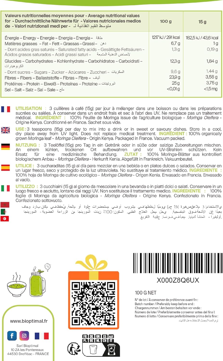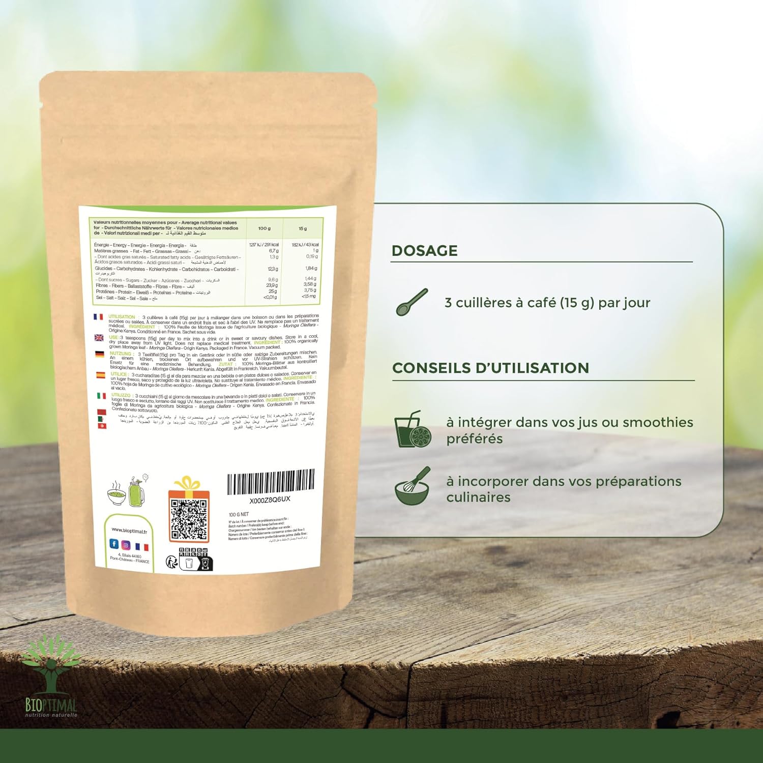 😍🙂 HOW TO CONSUME IT? Moringa powder easily integrates into your diet. In your favorite drink with a juice, mixed with water in a shaker or mixed with fruits or vegetables in a smoothie. Also in hot drinks (herbal tea, infusion), in your ready meals, at the end of cooking, to preserve nutrients (soups), or as a vinaigrette. Find our recipes by scanning the QR code on the back of the bag!