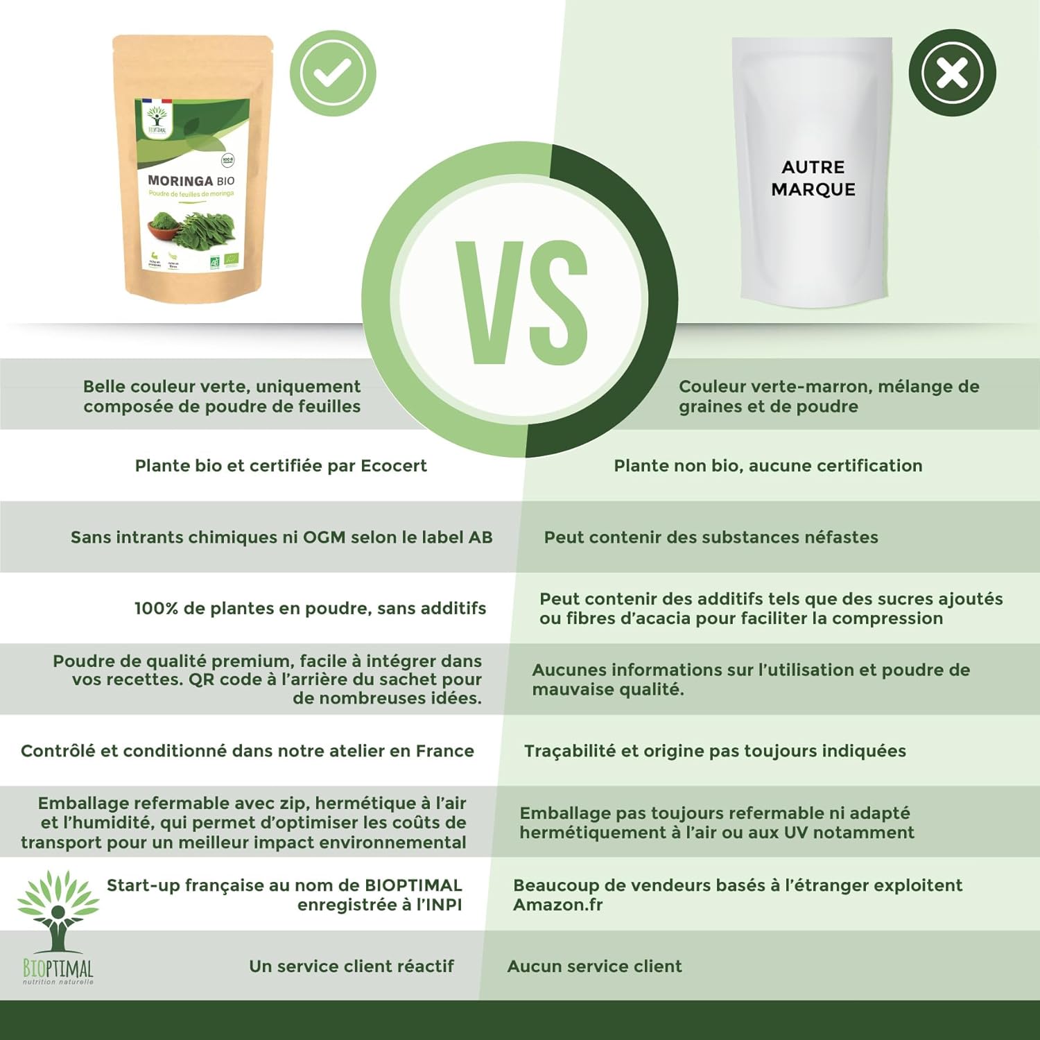Premium quality + safety: We have selected a pure moringa powder, of excellent nutritional and taste quality, which we pack in airtight bags to preserve all the nutrients. Grown in Kenya, our moringa comes from sustainable production. Guaranteed free of additives, heavy metals, GMOs, pesticides, gluten or animal abuse, it is checked in our family workshop in France and certified organic farming.