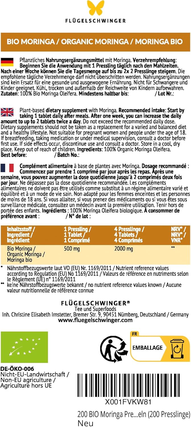 HIGHLY DOSED – Each tablet contains 500 mg of pure Moringa leaf powder. No binders, artificial preservatives, release agents such as magnesium stearate, colourings or flavourings, or genetically modified ingredients (GMO-free).