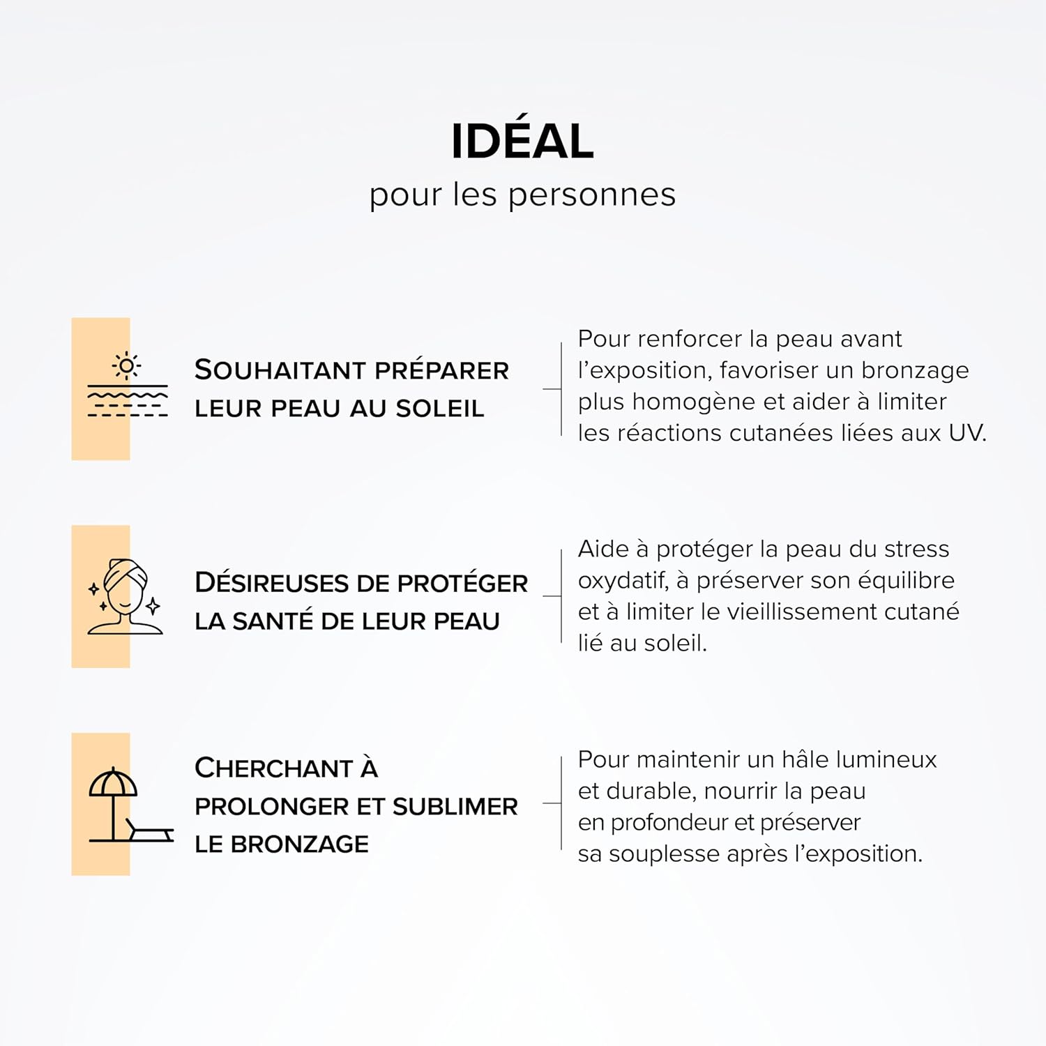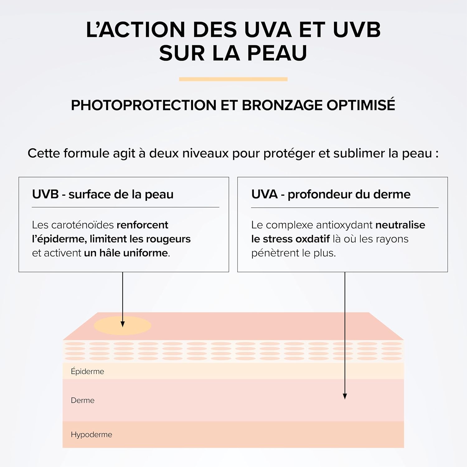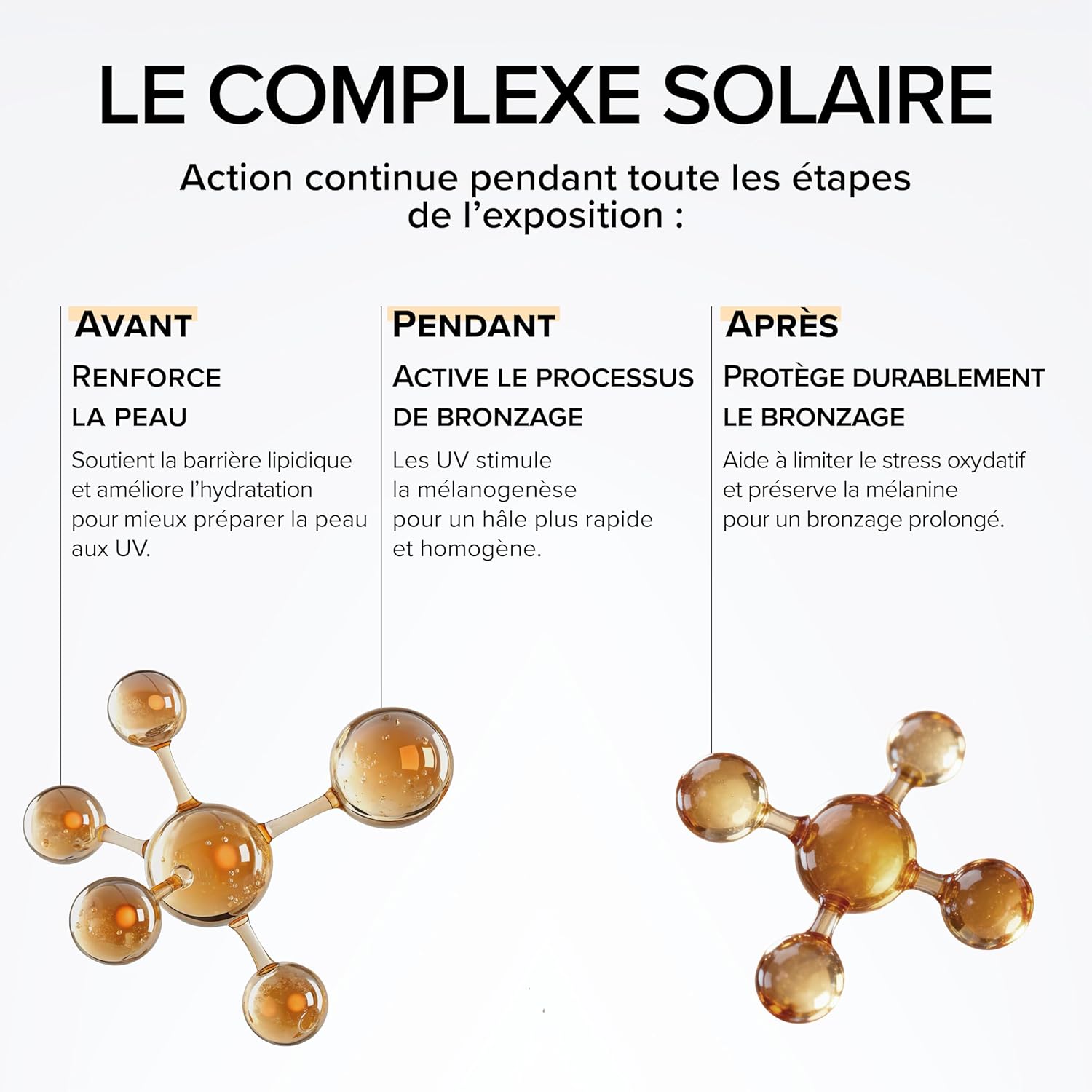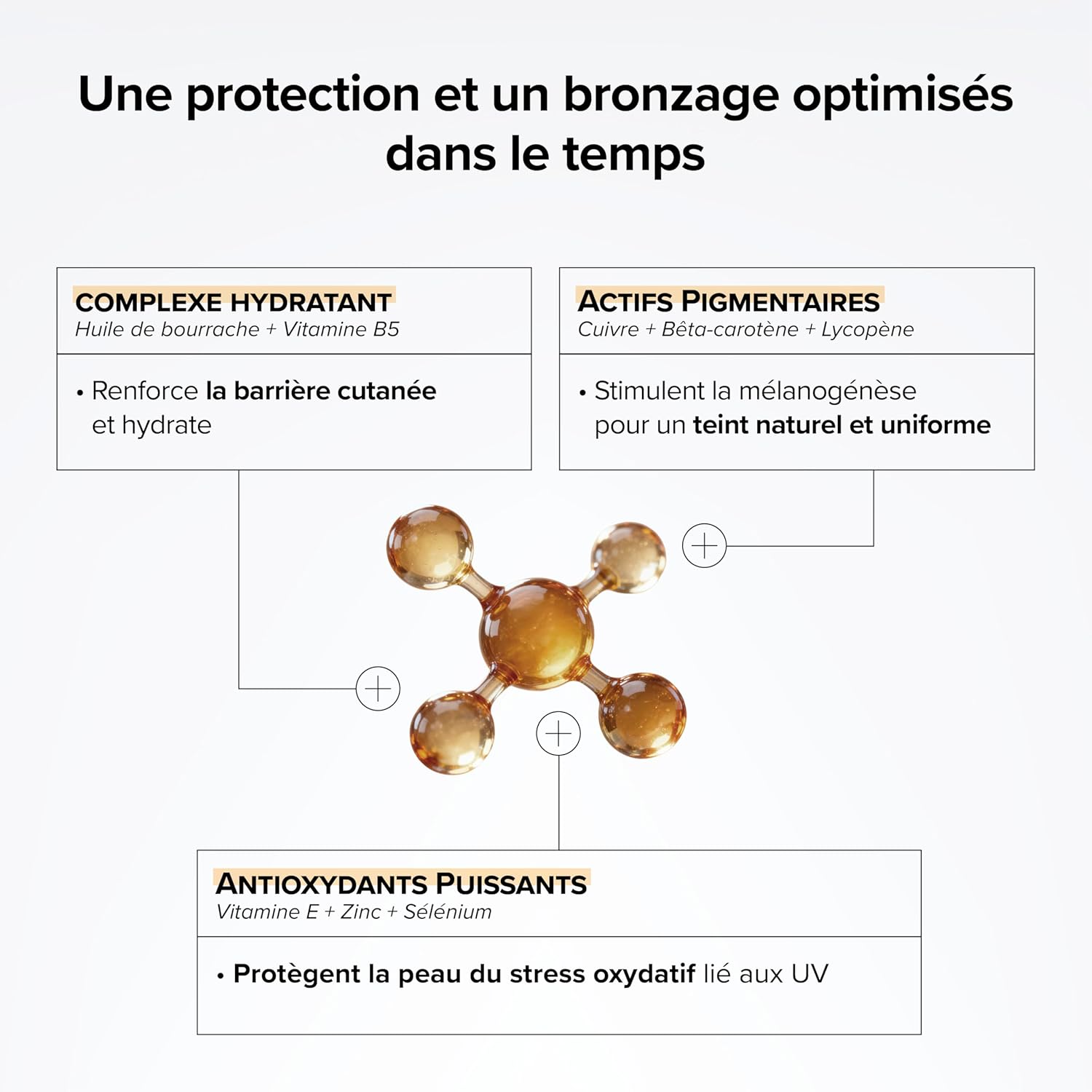 TRIPLE TARGETED ACTIONS: The formula accompanies the skin before, during and after sun exposure. Borage oil and vitamin B5 strengthen the skin barrier. Pigments activate tanning, prolonged by antioxidant action.