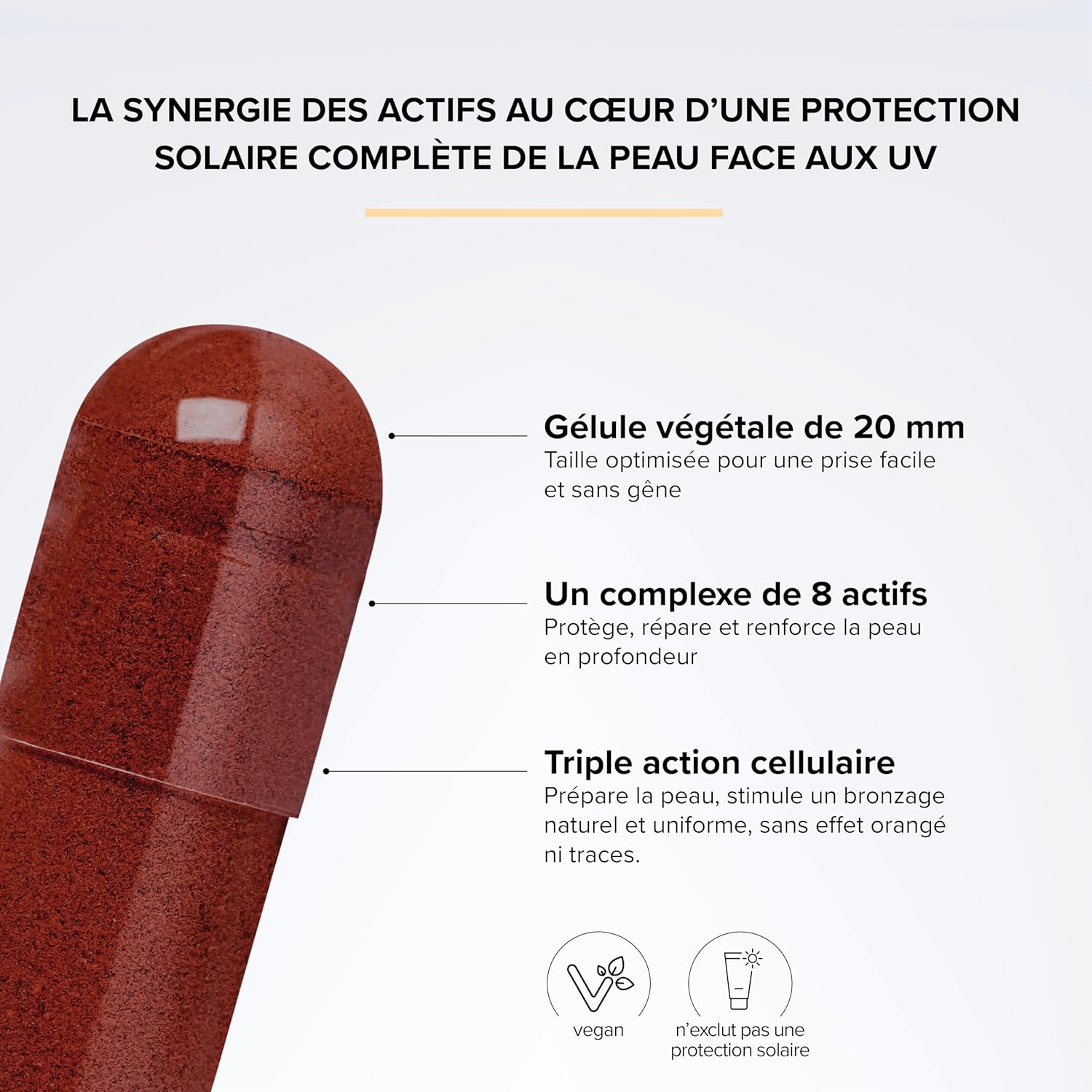 SOLAR PREPARATOR & TAN ACCELERATOR: Our supplement combines 8 active ingredients (carotenoids, lycopene, copper, vitamins E & B5, zinc, selenium, borage oil) to prepare the skin for UV rays and promote a natural and long-lasting tan.