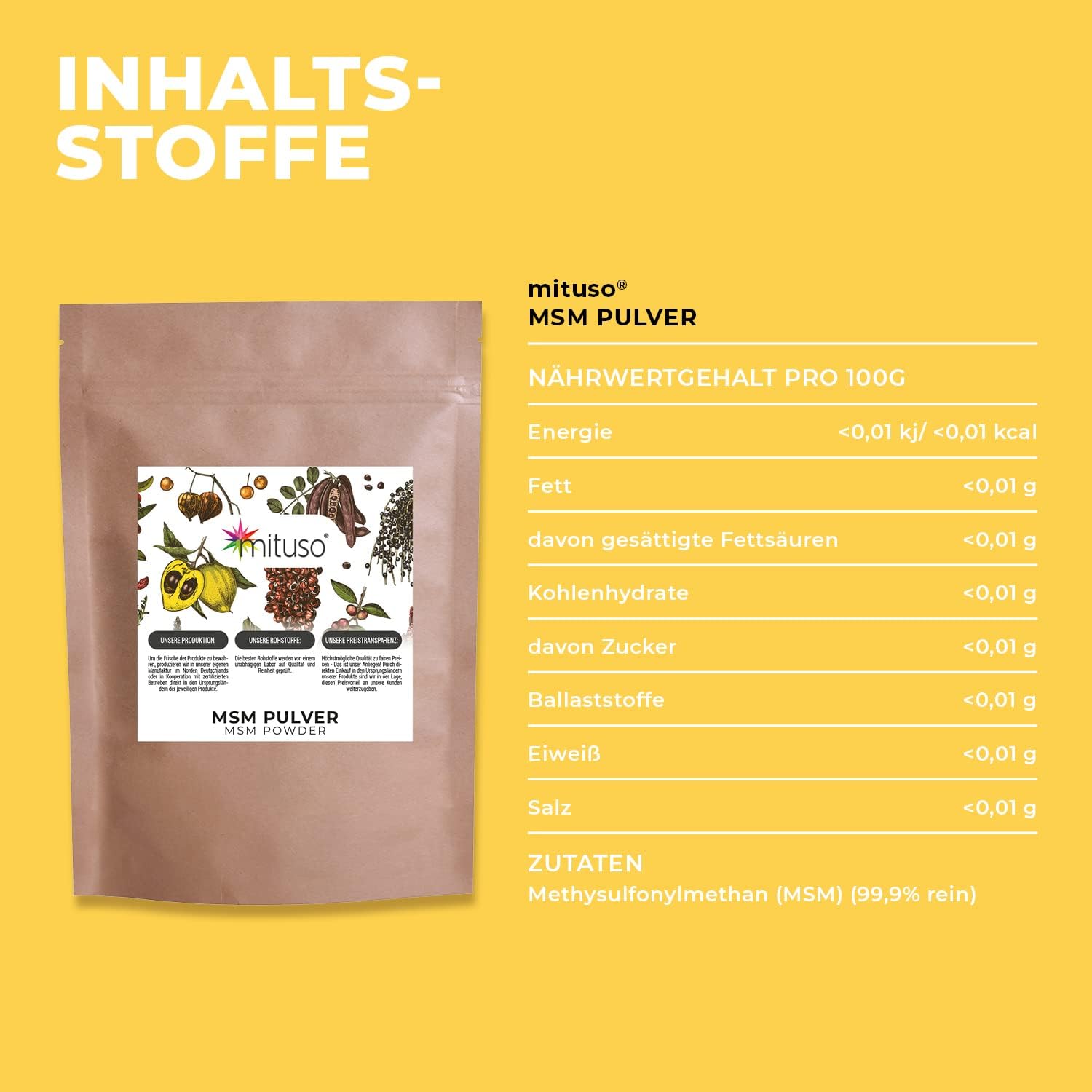Our MSM powder is of the highest quality and 99.9% pure, without any additives. We rely on purity and naturalness to offer our customers a product they can trust. 🙂🍁