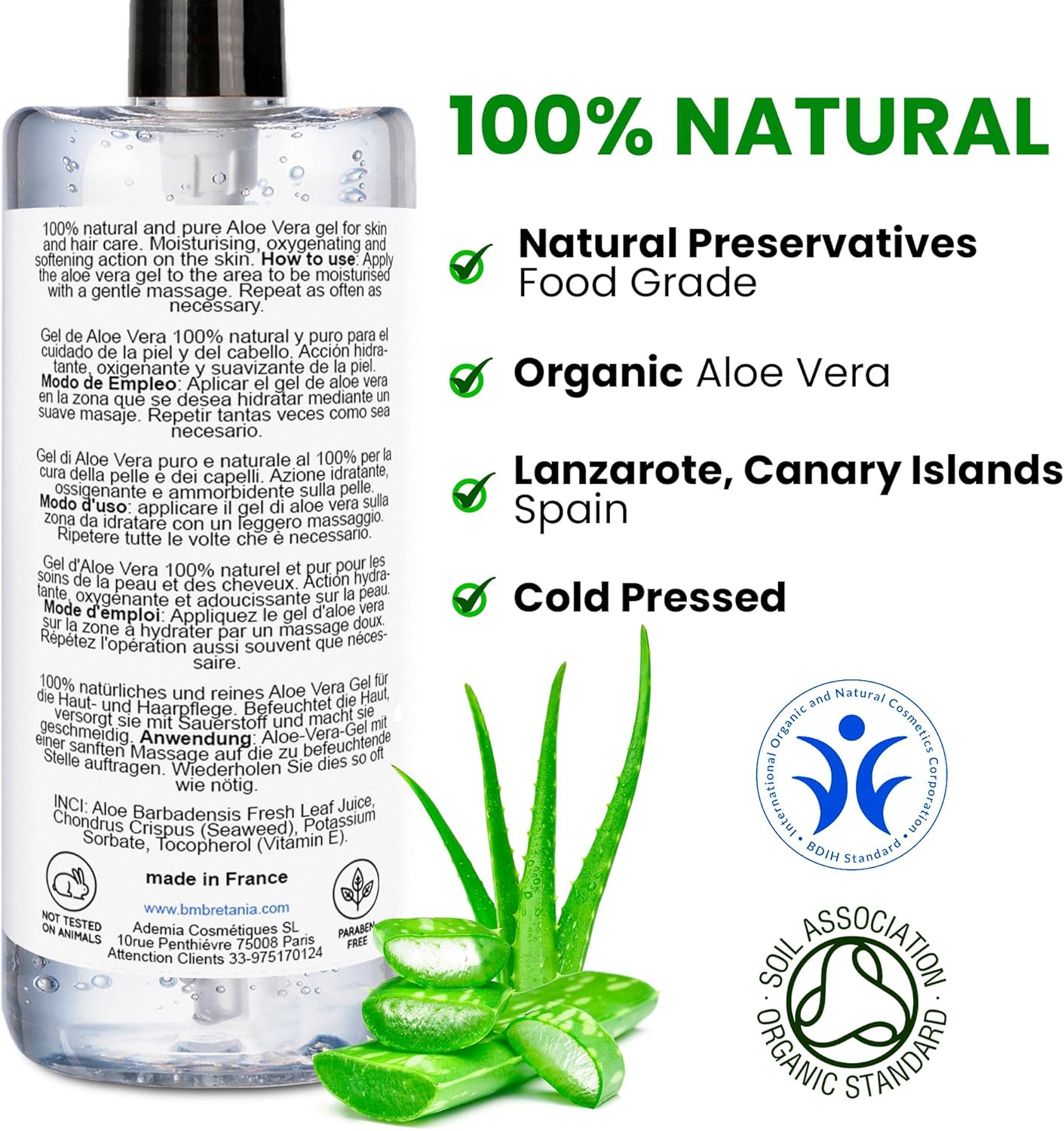 Aloe Vera n°1 Il s’agit d’une aloe 100% d’origine organique. Sans parabènes, silicones et produits chimiques. Provient de l’île de Lanzarote (Iles Canaries, SP), connue dans le monde entier pour la culture d’une aloe avec 6 fois plus de propriétés.