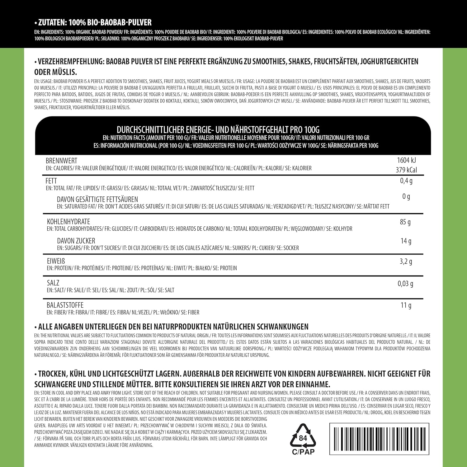 Multiple use: Baobab powder can be added to drinks, smoothies, yogurts, oatmeal or used to make baobab fruit juice and as an ingredient in baking, such as in muffins, bread and pancakes.