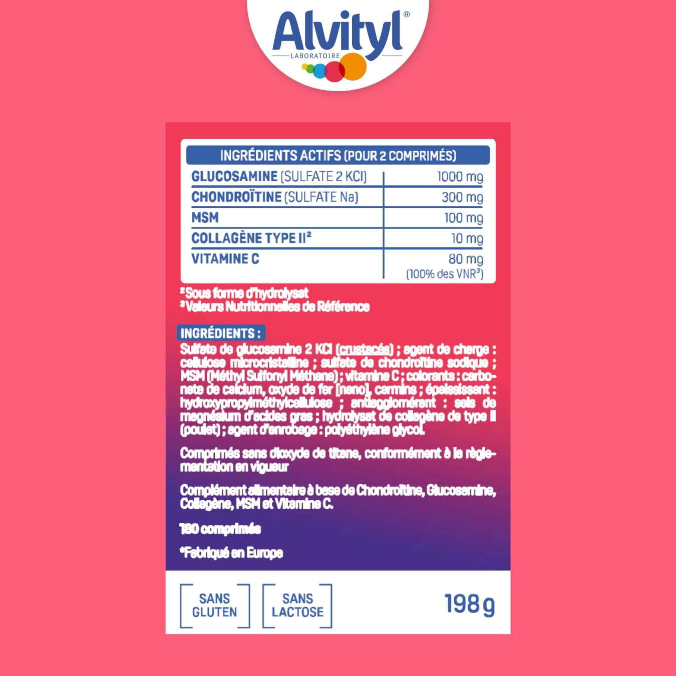 Joint discomfort is not only the prerogative of seniors, 9 to 10 million French people are affected. Unpleasant sensations in the joints (knees, hip, back, ankle, wrist, shoulder) may appear in the course of life. Beyond aging, sports, excess weight, traumatic shocks (fracture, sprain), repeated and sometimes violent movements of certain professions are all factors that can weaken joints and participate in cartilage wear. Alvityl Chondroflex has a unique and complete formula for joint well-being. The Alvityl brand: a small gesture to grow well since 1959 Alvityl is the ally of families, accompanies them on a daily basis to help their child grow well and help adults to be in shape. Our exclusive and comprehensive formulas meet the specific needs of each child regardless of age up to adults and seniors. DO NOT CONSUME IN CASE OF CRUSTACE ALLERGY.