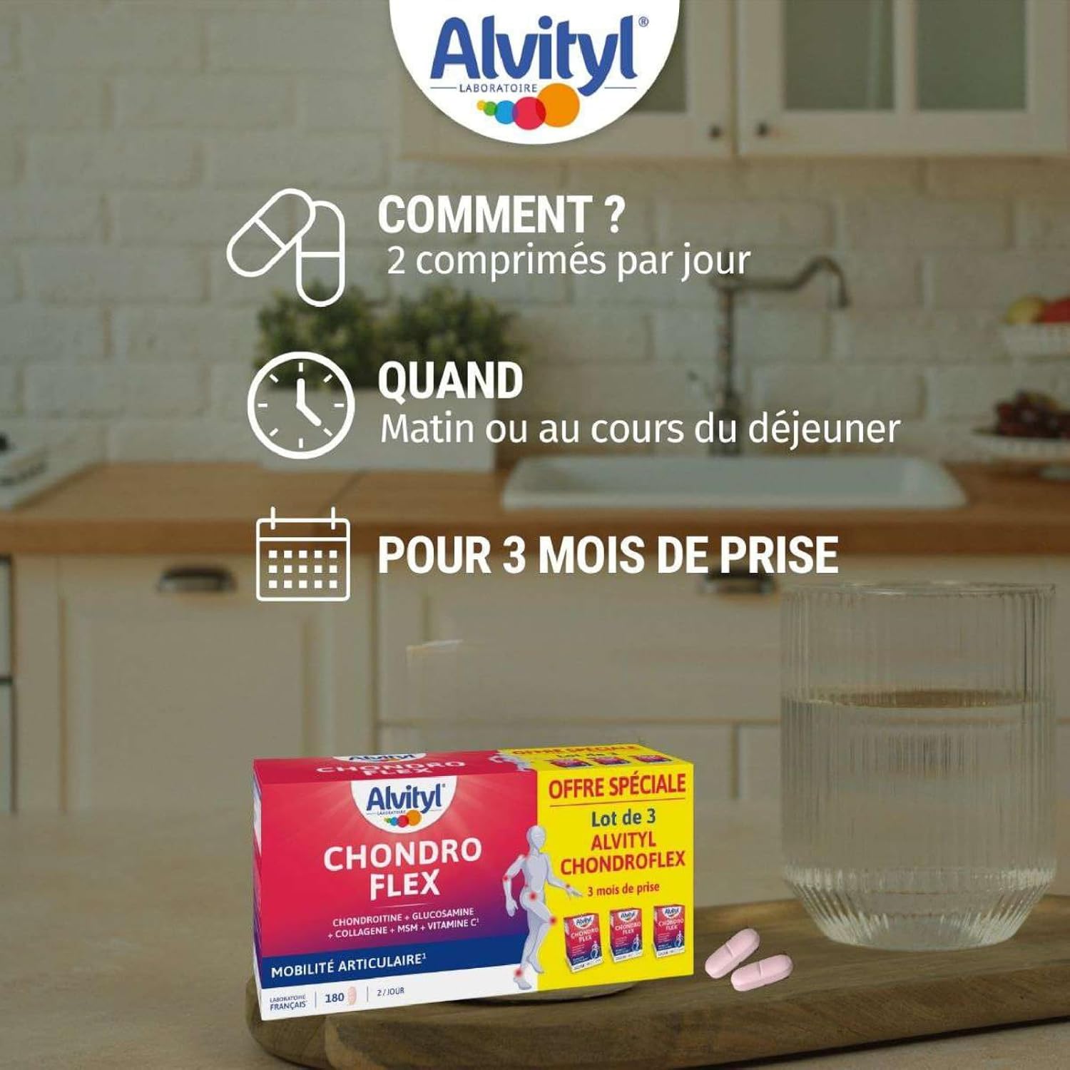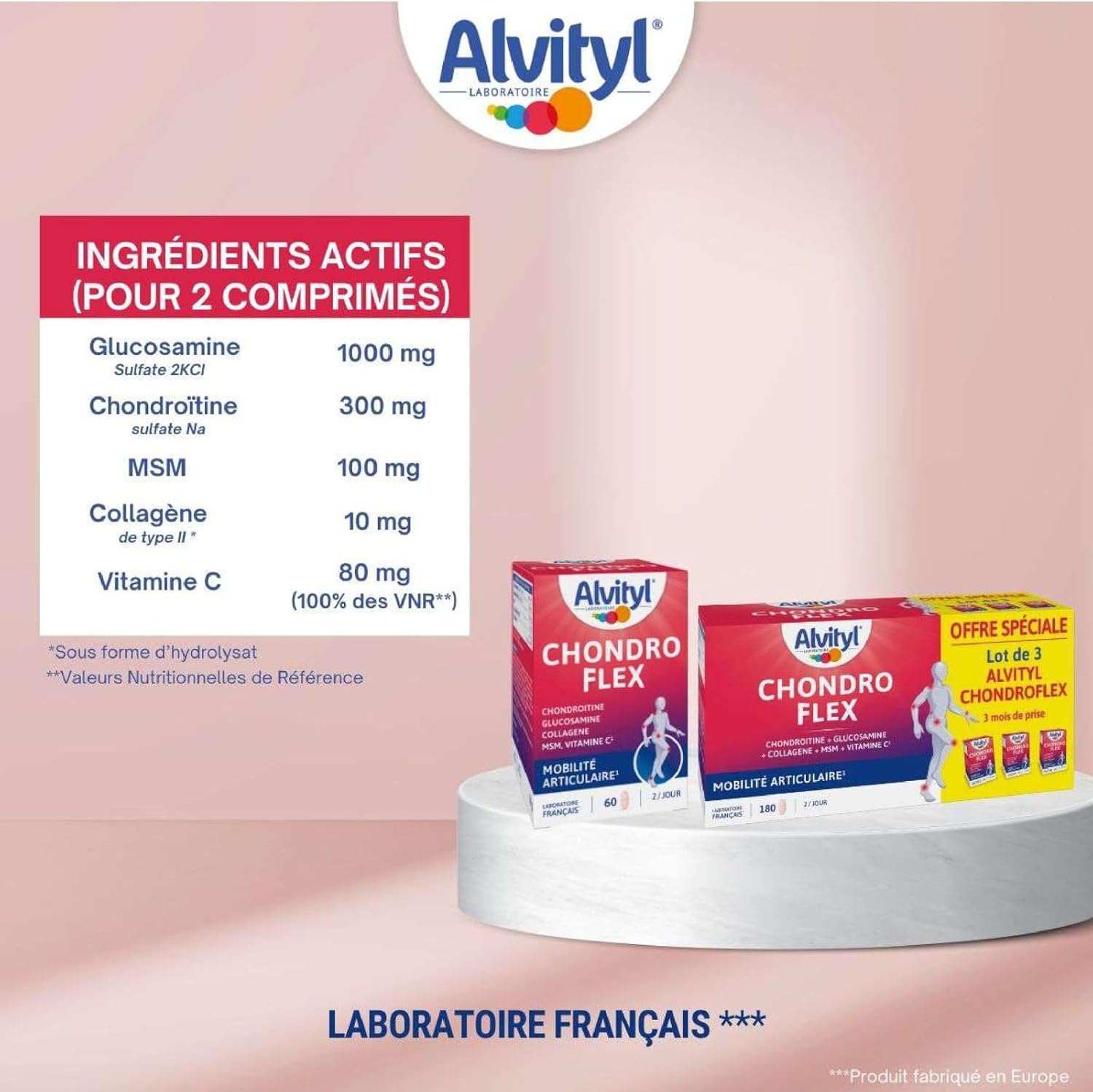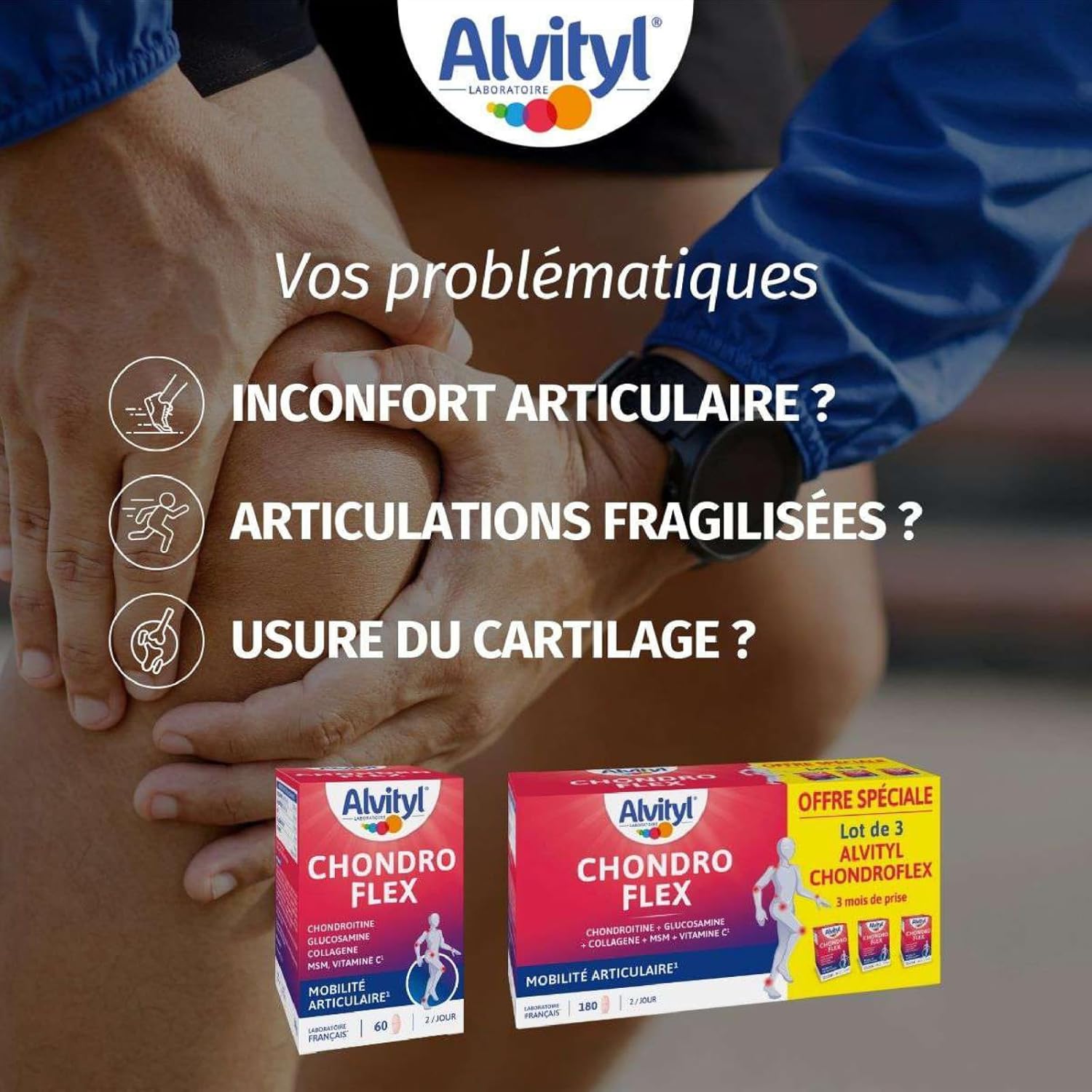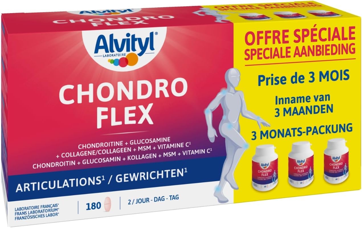 ALVITYL – Chondroflex – 5 essential elements – Joint mobility – 90 days renewable dose – Chondroflex – Glucosamine + Chondroitin + Collagen Type II + MSM + Vitamin C – 180 tablets