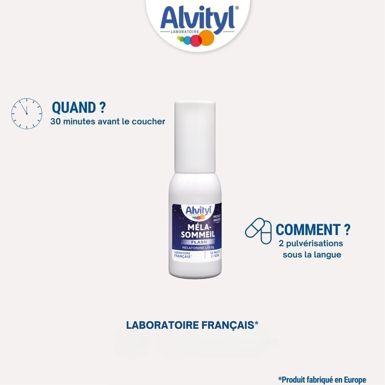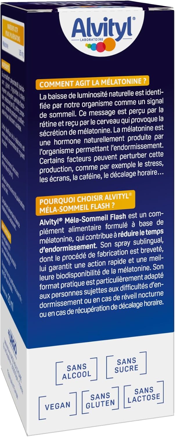Nearly a third of French people say they suffer from at least one physiological sleep disorder(1). Stress, noise, jet lag, caffeine are all factors that can affect sleep. Lack of sleep is the first factor affecting intellectual abilities and physical abilities. Without a restful sleep, the days can then be difficult… Alvityl Méla-Sommeil FLASH is a sublingual spray for fast action. The Alvityl brand: a small gesture to grow well since 1959 Alvityl is the ally of families, accompanies them on a daily basis to help their child grow well and help adults to be in shape. Our exclusive and comprehensive formulas meet the specific needs of each child regardless of age up to adults and seniors. (1) OhayonM. Prevalence and comorbidity of sleep disorders in the general population. The Practitioner’s Review. Vol 57. 09/2017 Gluten free Ingredients Water, emulsifier: polyoxyethylene sorbitan monolaurate, thickener: glycerol, medium-chain triglycerides, antioxidant: ascorbyl palmitate, melatonin, flavouring, preservative: potassium sorbate, acidifier: citric acid, sweetener: sucralose. Natural aroma (lemon). Safety warning. Directions for use: Shake well before use. 2 sprays in the mouth, under the tongue for quick action. Maximum 2 sprays per 24 hours: • In case of waking up at night: take overnight as soon as you wake up. • In case of problems falling asleep: take in the evening 30 minutes before bedtime. • In case of jet difference: to be taken before bedtime on the first day of the trip and the few days following the day of arrival at destination. Melatonin food supplement with sweetener. This bottle allows about 100 sprays or 50 nights. Use within 3 months of first use. Precautions for use: Melatonin can take effect up to 4 or 5 hours following its intake. As a precautionary principle, it is not recommended to drive during this period of time. • Do not exceed the recommended daily dose. • Reserved for adults from 18 years old, not recommended for children and teenagers. • Can not replace a varied and balanced diet and a healthy lifestyle. • Keep out of reach of children. • Keep away from light and heat. • Not recommended for pregnant or lactating women. • People under medical supervision should seek advice from their doctor before taking this supplement. Laboratoires URGO, 42 Rue de longvic 21300 Chenove, France Disclaimer Cannot replace a varied and balanced diet and a healthy lifestyle. Dietary supplement. Any reviews and comments relating to the products are the sole responsibility of their authors, they are in no way endorsed or endorsed by the Supplier. If you have any questions about this product or if you have an adverse reaction, please contact serviceconso21@gmail.com See more.