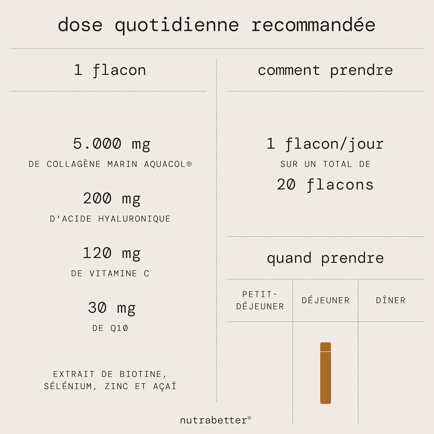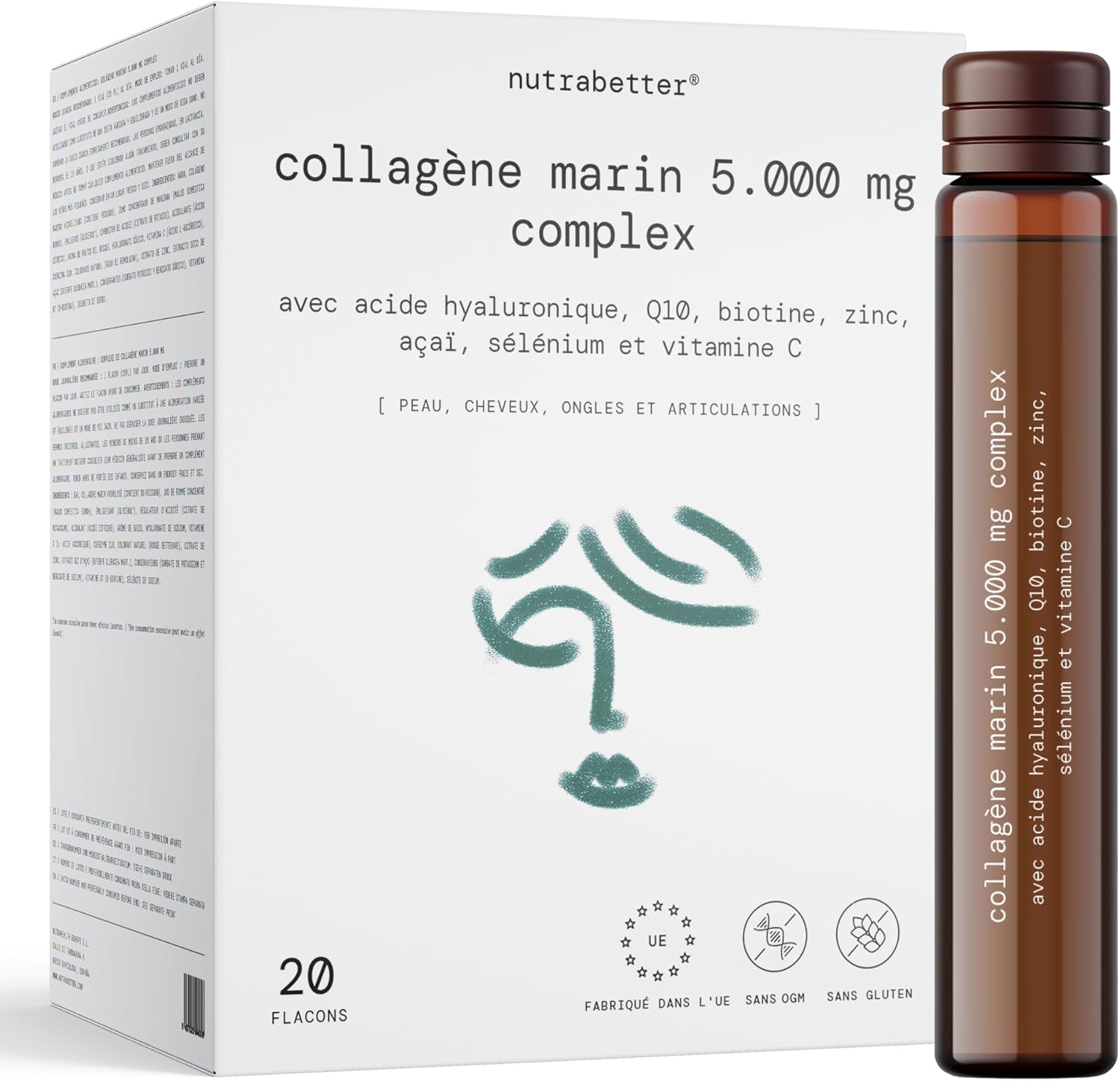 Each daily dose of oral collagen (1 vial) provides 5,000 mg of hydrolyzed marine collagen, which is equivalent to between 10 and 15 times more collagen than the capsule format. It also contains 200 mg of hyaluronic acid, guaranteeing a high concentration of active ingredients for optimal and visible results.