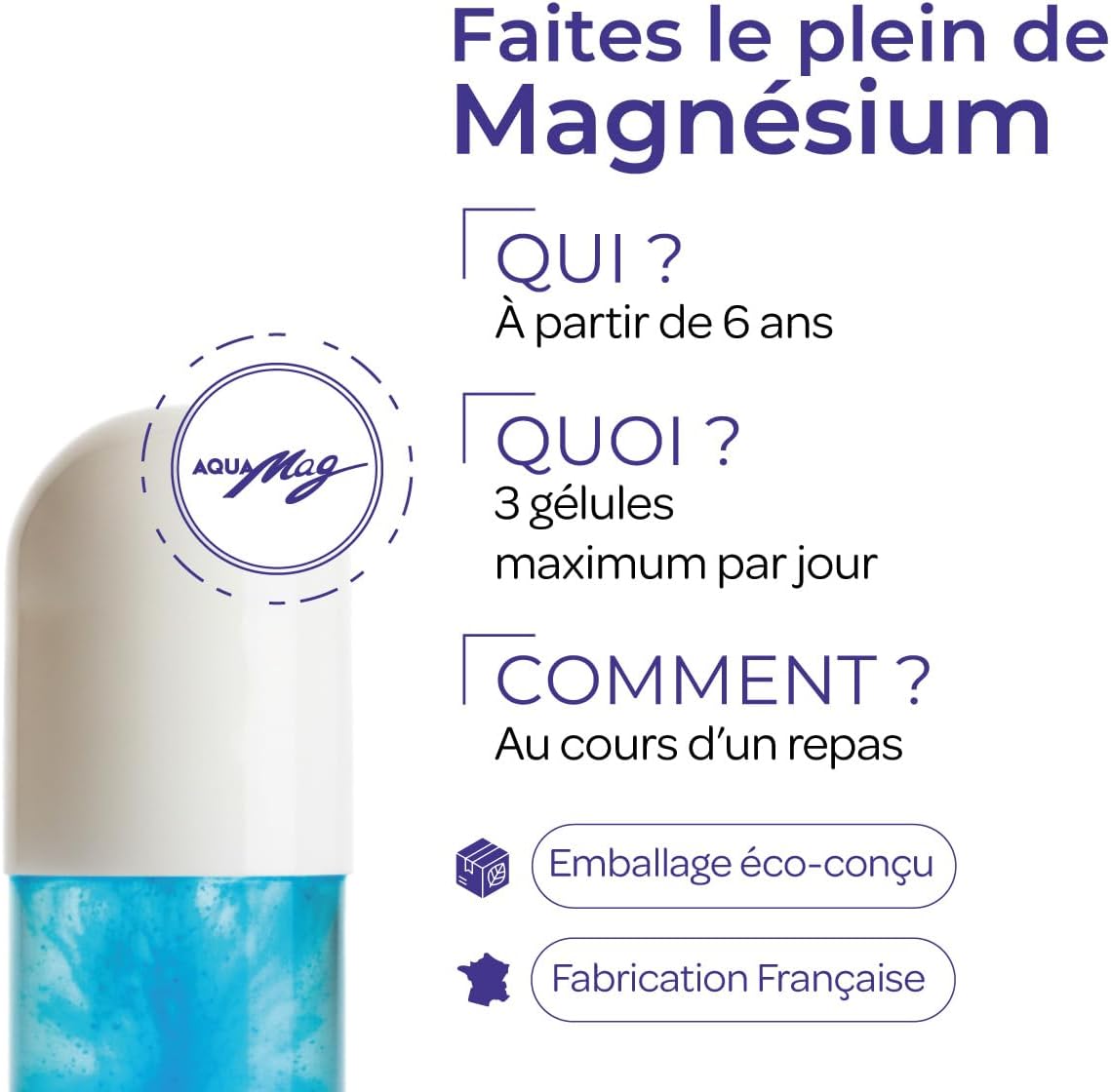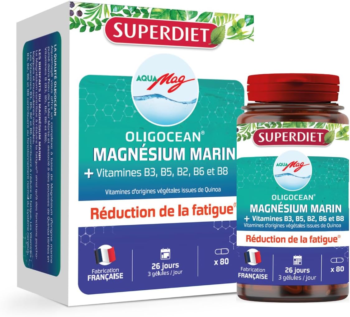 OLIGOCEAN – Aquamag -Marine Magnesium – Vitamin B3, B5, B2, B6 and B8 – Reduce fatigue – Made in France – 80 capsules ✦ Lithothamne (Lithothamnium calcareum), magnesium oxide, gelling agent: hydroxypropylmethylcellulose, filler agent: cellulose, oyster powder (crassostrea giga) (binder: tapioca aindon, flavouring), coating agent: magnesium stearate, firming: methylcellulose, vitamin B6, vitamin B9. May contain traces of CRUSTACEEA, FISH AND MOLLUSCS // For 2 capsules: 400mg of Lithothamnium calcareum, 125 mg Calcium content, Magnesium 300mg, 2mg Vitamin B6, 200 µg Folic Acid ✦ Take 3 capsules daily, with meals. ✦Not recommended for pregnant and lactating women. It is recommended to adhere to the recommended doses, to ensure that you have a varied and balanced diet and a healthy lifestyle. Keep out of reach of young children. ✦ OUR VALUES ✦ Oligocéan combines French know-how and the benefits of marine plasma to serve health. Our range of dietary supplements is formulated from the richness of the ocean in accordance with the principles of René Quinton.