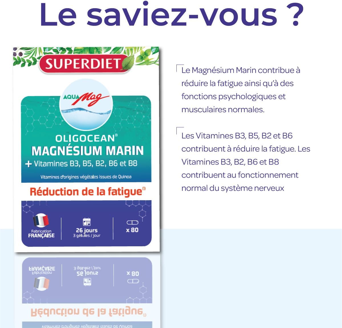 REDUCTION OF FATIGUE ✦ Magnesium, this major mineral, participates in normal psychological and muscle functioning, and naturally helps to reduce fatigue. Stock up on Magnesium with Oligocéan Aquamag.