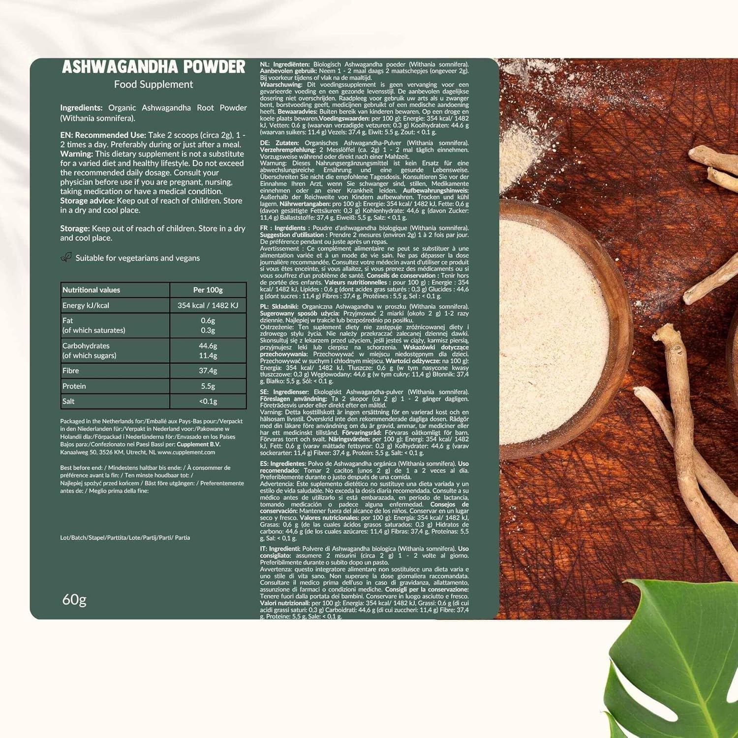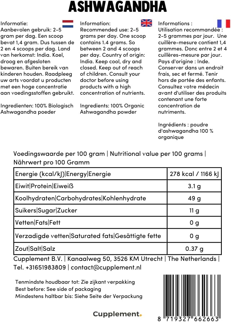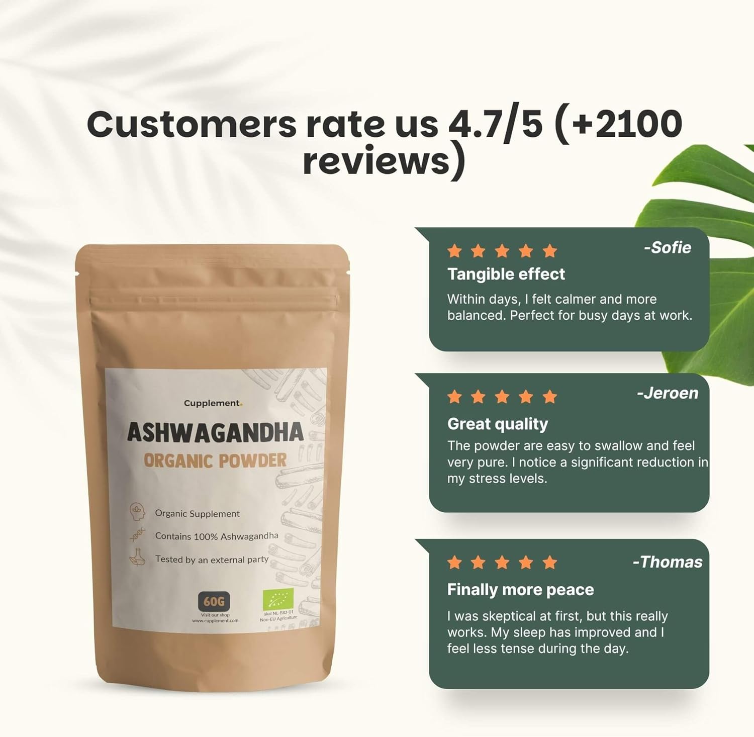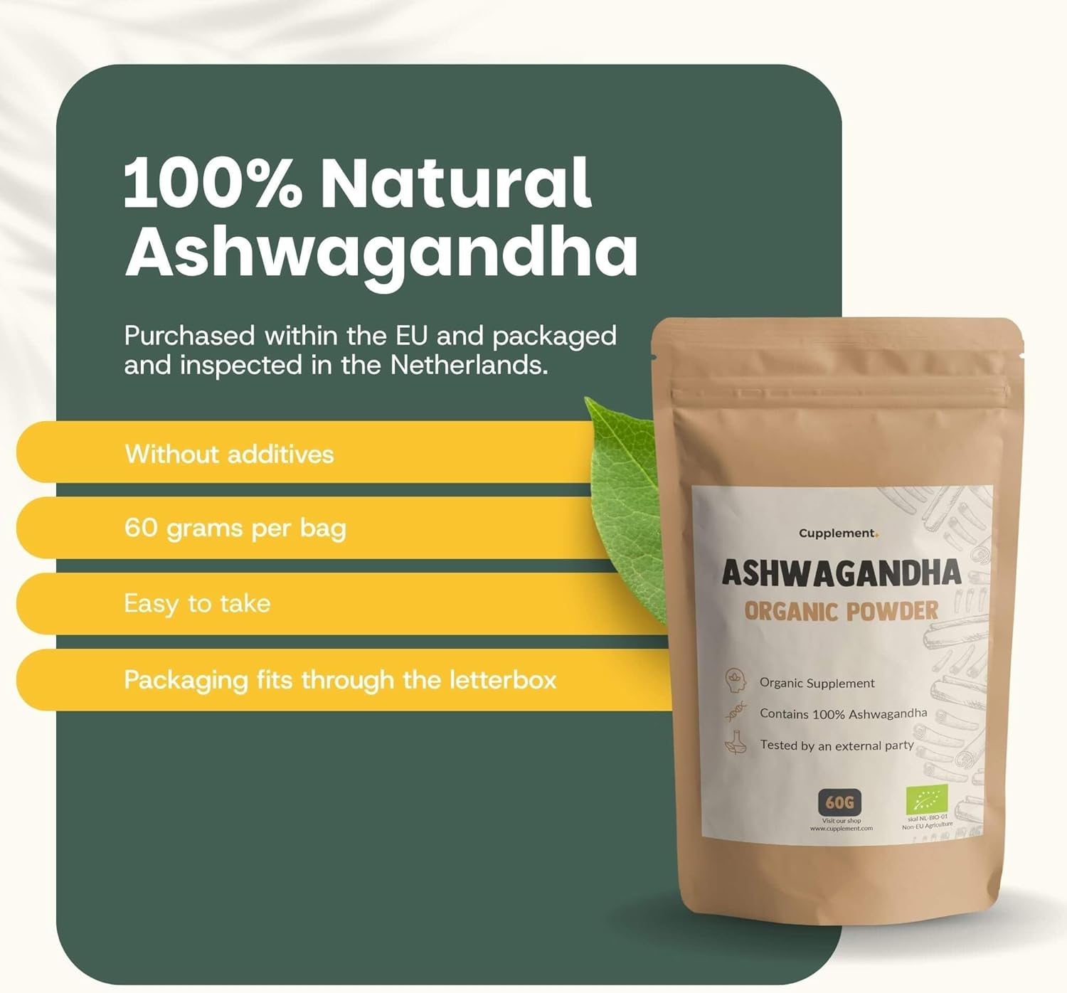 Highest quality: Cupplement stands for healthy products and the highest quality. This ashwagandha powder contains 5.27% withanolide. Selected natural products come from different parts of the world. All products are checked and packaged in Europe. The ingredients are free of additives such as sugars, fats and comply with all European pesticide requirements.