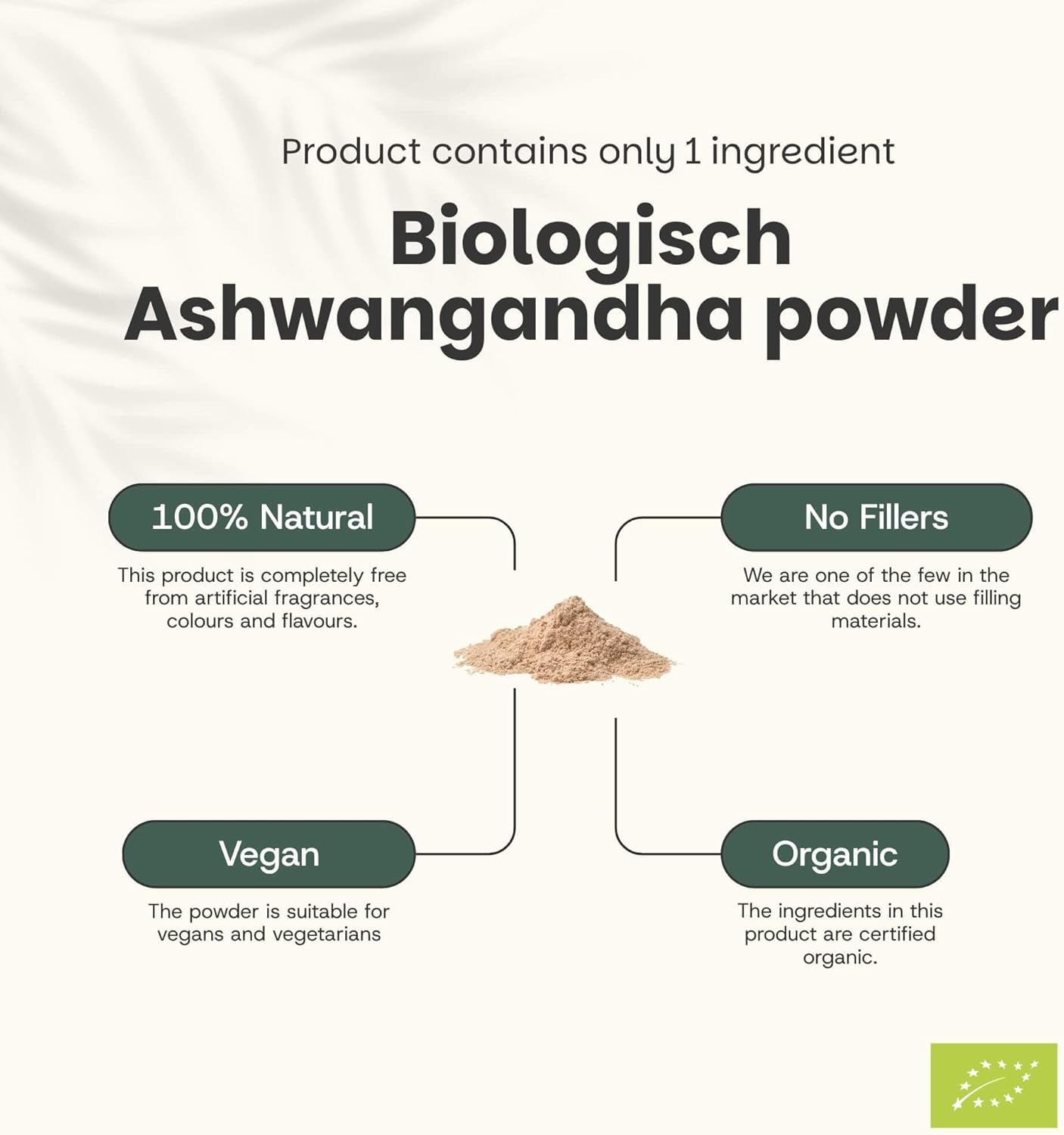 Transform your health and wellness routine with our organic ashwagandha powder, made from the finest Ashwagandha roots grown in India and hand selected. This powerful adaptogen plant has been used for thousands of years in Ayurvedic medicine to promote stress management, boost energy and endurance and improve overall well-being. Our organic ashwagandha powder is carefully processed to retain all the vital nutrients and compounds, so you can enjoy all the benefits of this powerful superfood. Just add a spoonful to your favorite drink or recipe for a natural boost of energy and peace of mind. With its slightly bitter and earthy flavor, ashwagandha is a great addition to coffee, smoothies, lattes or even pastries. Certified organic and free of harmful chemicals or additives, our ashwagandha powder is the ideal choice for those who value both health and sustainability.