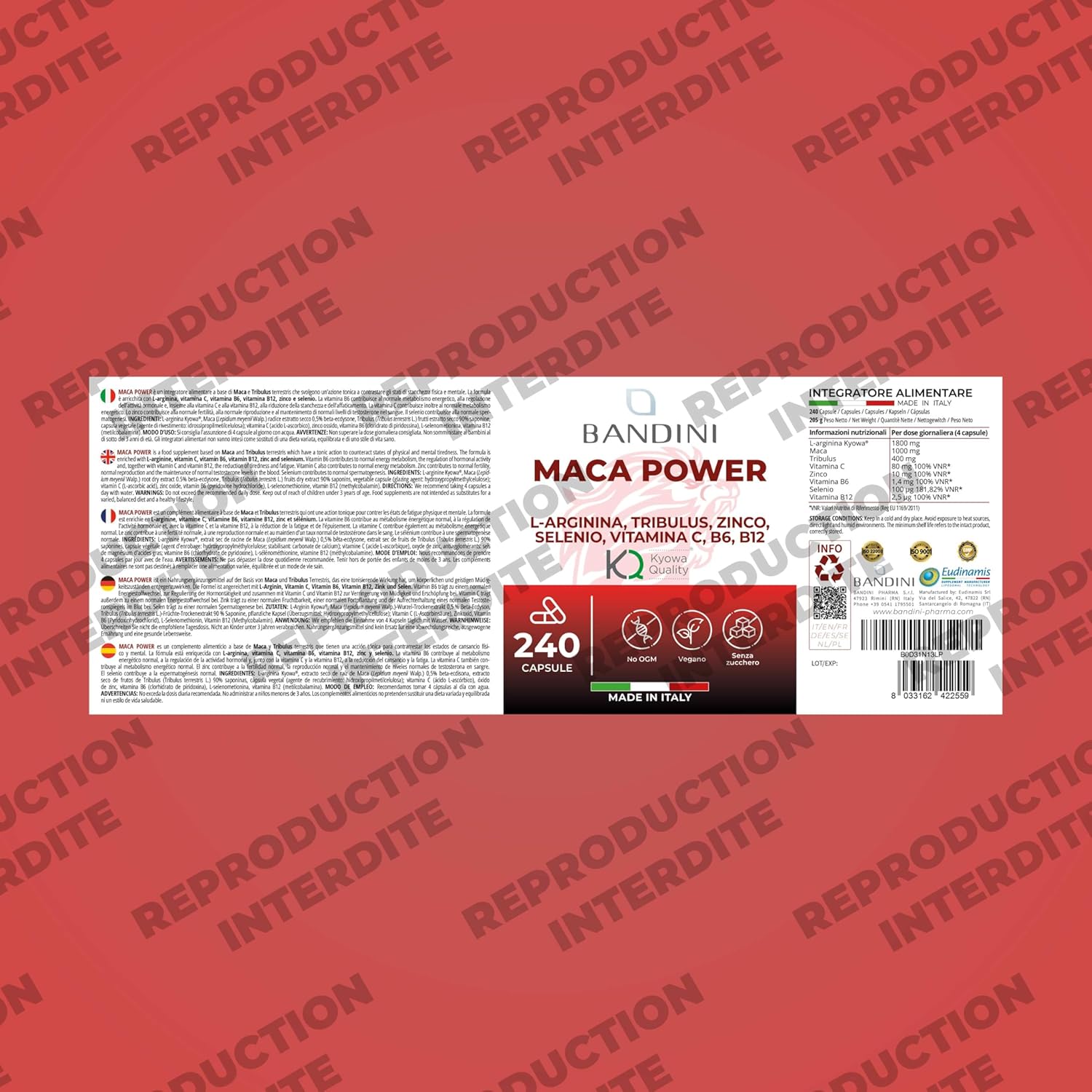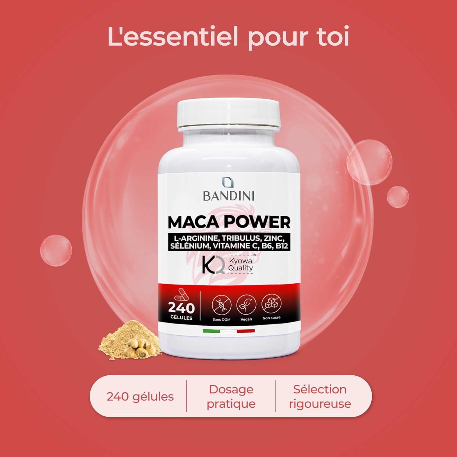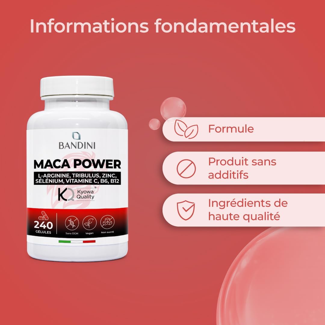 Tested quality. The Maca Power 240 capsules from BANDINI Pharma have been created through careful selection of raw materials. The formula is enriched with arginine, vitamin B6, vitamin B12 and zinc. Our product is naturally GMO free, flavour-free and titanium dioxide free.