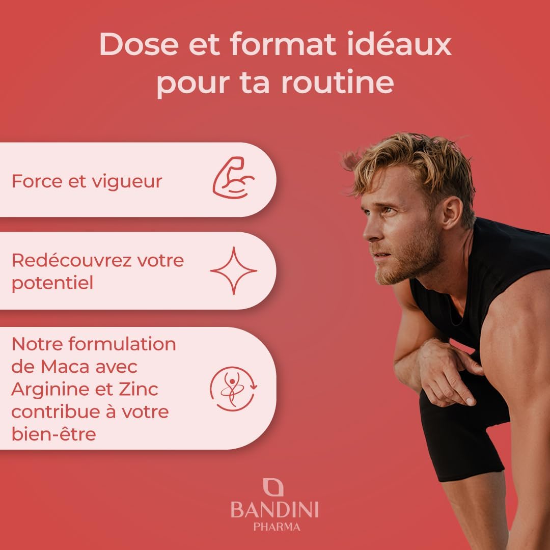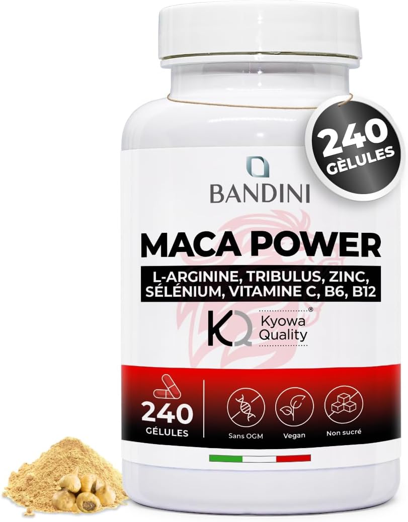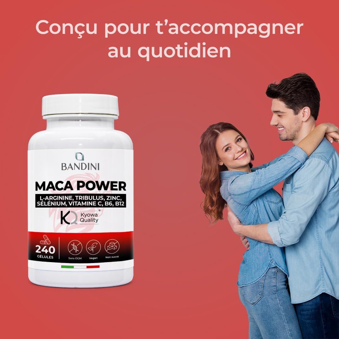 Tested quality. The Maca Power 240 capsules from BANDINI Pharma have been created through careful selection of raw materials. The formula is enriched with arginine, vitamin B6, vitamin B12 and zinc. Our product is naturally GMO free, flavour-free and titanium dioxide free.