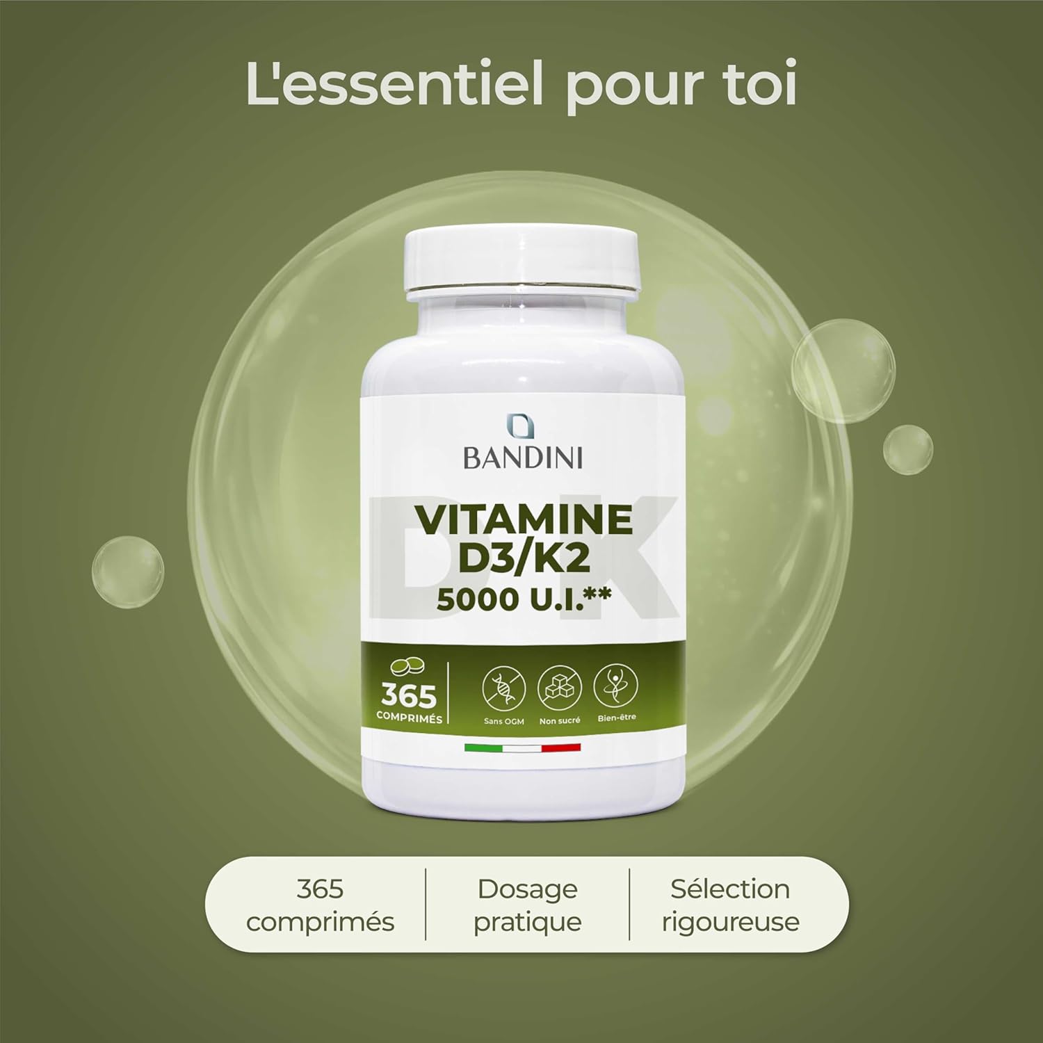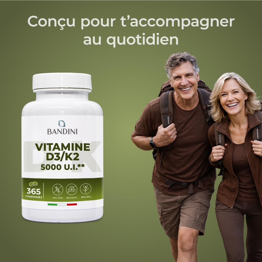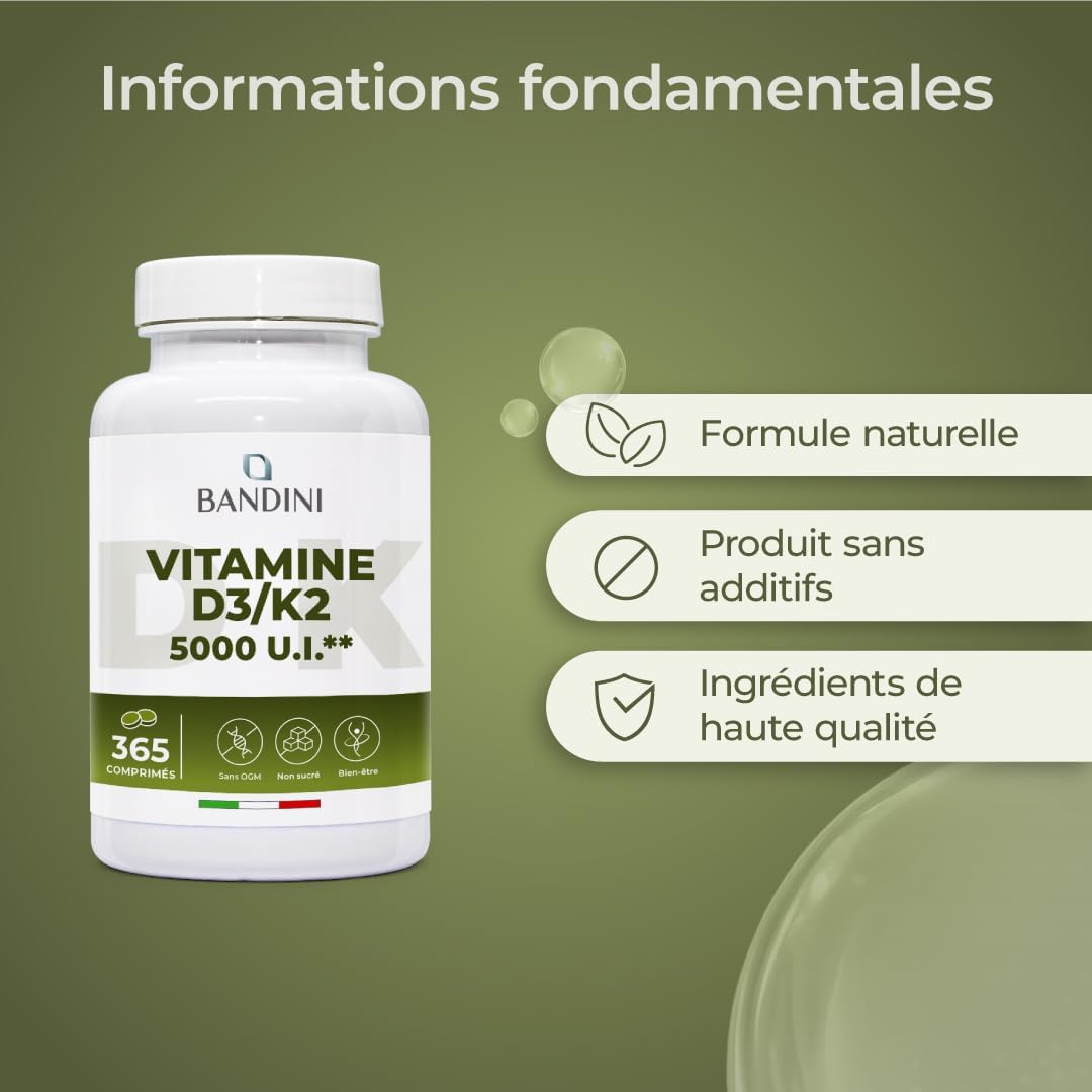 Bandini Vitamin D3 K2 365 Tablets 30,000 IU per month, Vitamins D 5000 IU/tablet, Premium Quality, 100 mcg K2, 99.7+% All-Trans K 2-MK7 + 125mcg Cholecaciferol, Bones, Teeth, Immune System