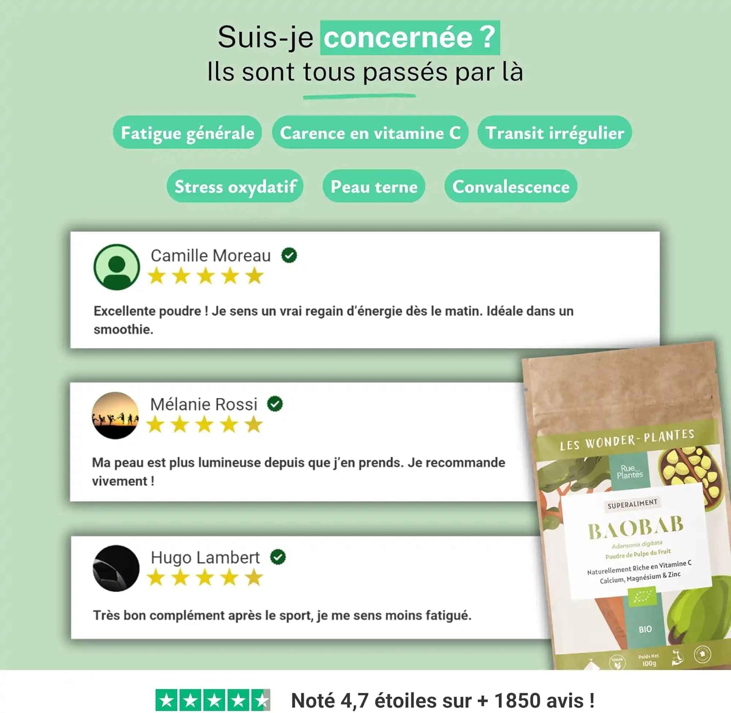 ❃ VITALITY & NATURAL ENERGY: Rich in vitamin C and essential minerals, organic Baobab can help reduce fatigue and support overall tone. This ancestral superfood helps maintain a good level of energy on a daily basis, ideal during periods of decline in shape or changes in season.