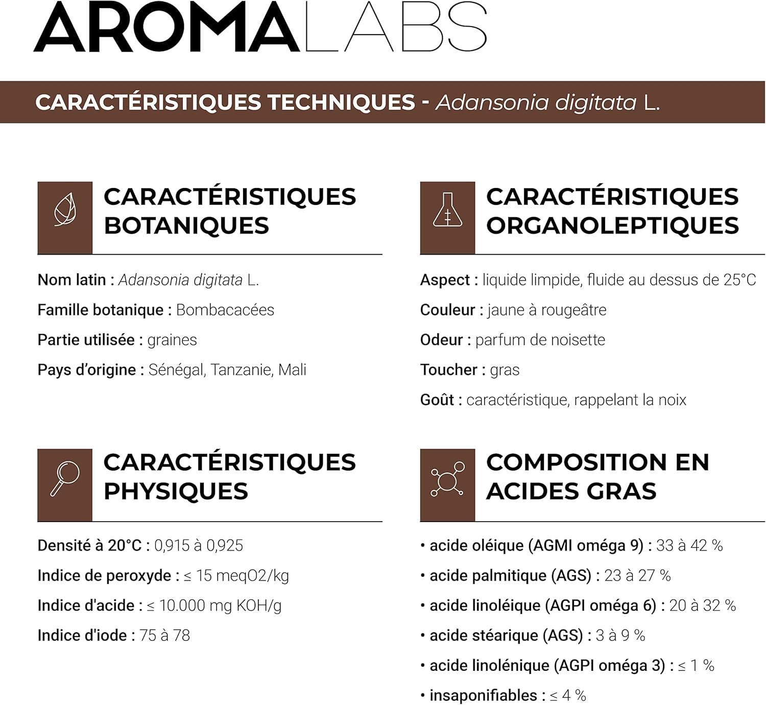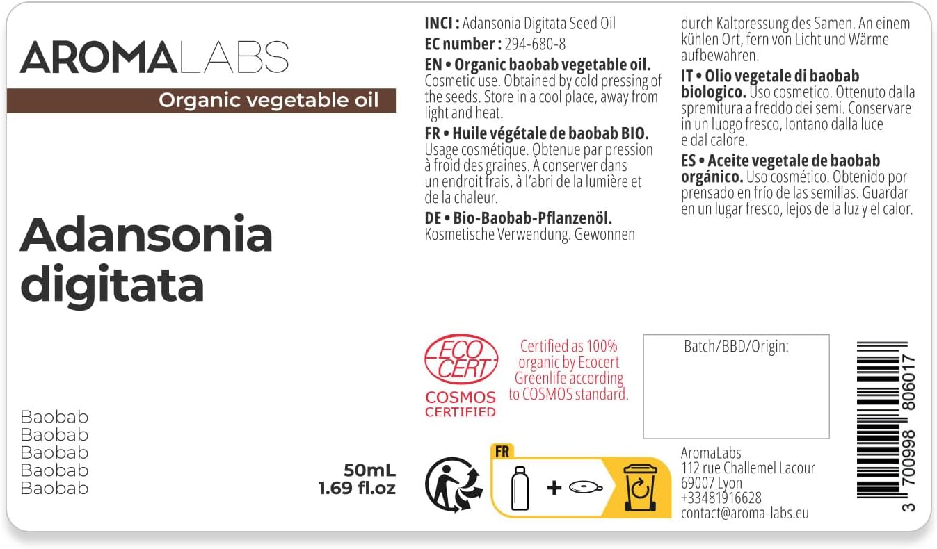 Baobab Organic (Adansonia digitata) 50 ml Virgin and Cosmos Certified Vegetable Oil Aroma Labs Made in France