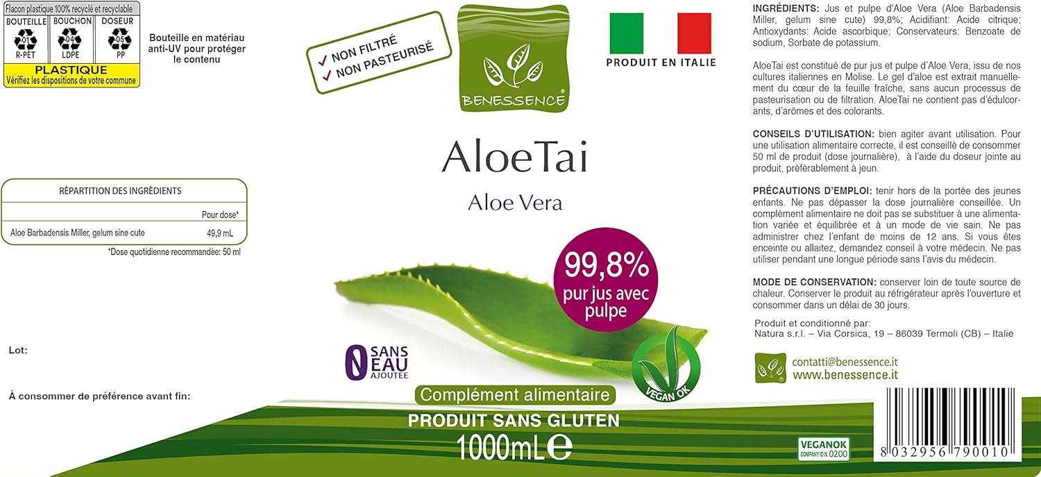 HIGH QUALITY JUICE: 100% Benessence Aloe Vera Juice. It is formulated with minimal treatment so as not to alter the natural components of the plant and make the most of its benefits. The result is a product NOT filtered and NOT pasteurized, composed only of real pulp, to give you a complete perception of Aloe Vera. THIS PRODUCT DOES NOT CONTAIN ALOIN.