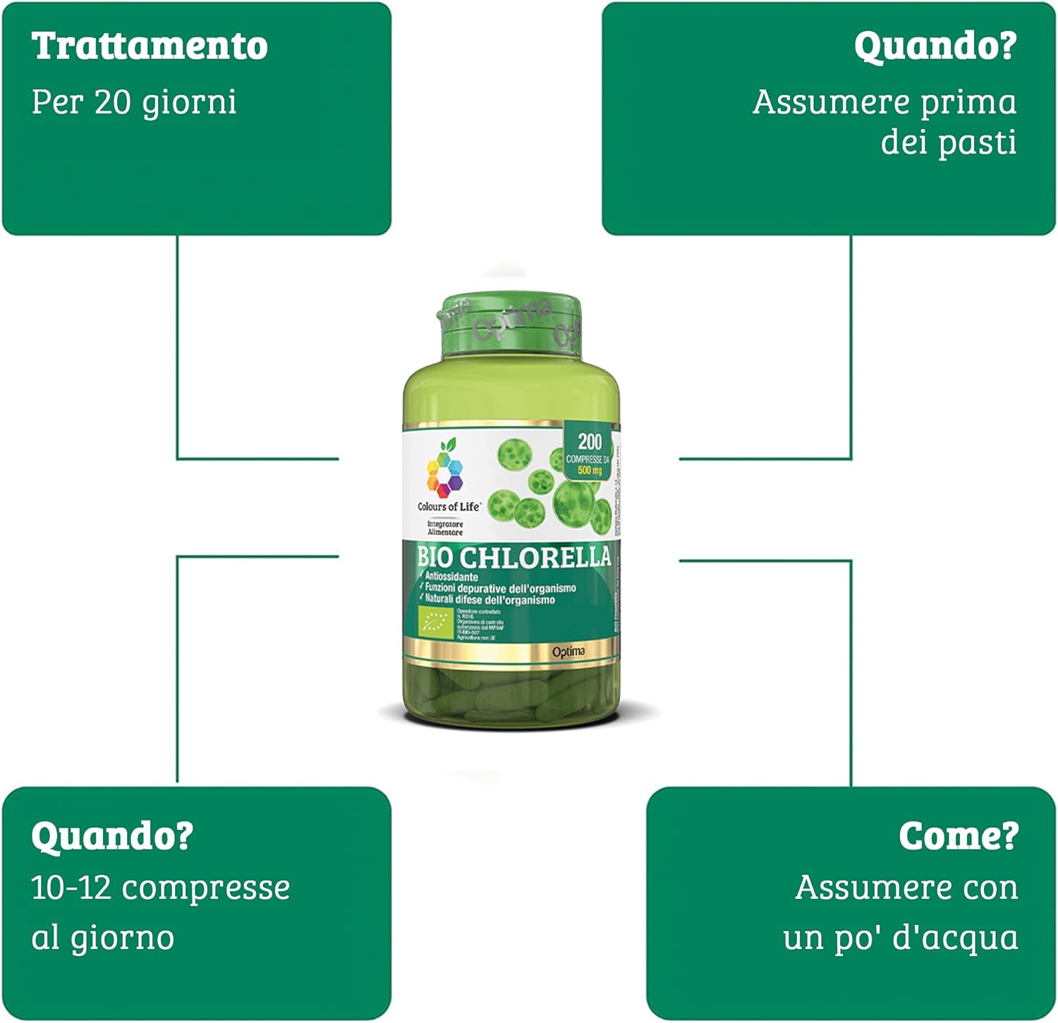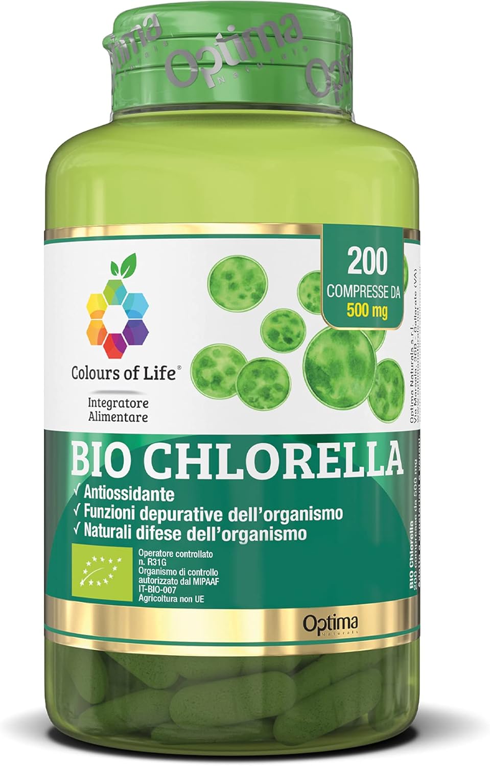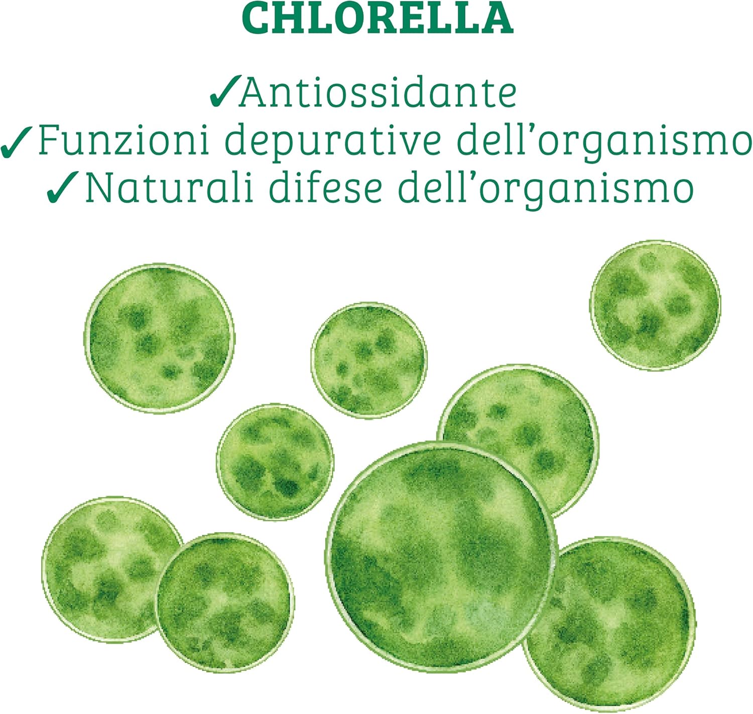 BIO CHLORELLA is a dietary supplement in the form of tablets based on 100% organic Chlorella, a microalgae naturally rich in functional substances, especially chlorophyll, which allows it to be used as a body wash. The tablets are cold pressed and contain only 100% chlorella, without additives or excipients. This microalgae contains large amounts of chlorophyll and xanthophylls. It is precisely because of the high percentage of chlorophyll (1-4%) that the highest of microalgae has the effective ability to chelate toxic metals (including lead and mercury) that can accumulate in the body, but also other components toxic to the body, such as phthalates and insecticides. It is a source of many nutrients, such as vitamins (A, C, E, D, K and some of group B) and minerals, especially iron. potassium. Magnesium and Phosphorus. It has a high protein content, between 55 and 67% of dry weight, and contains many amino acids, including the 8 essential ones (including leucine, valine and lysine).