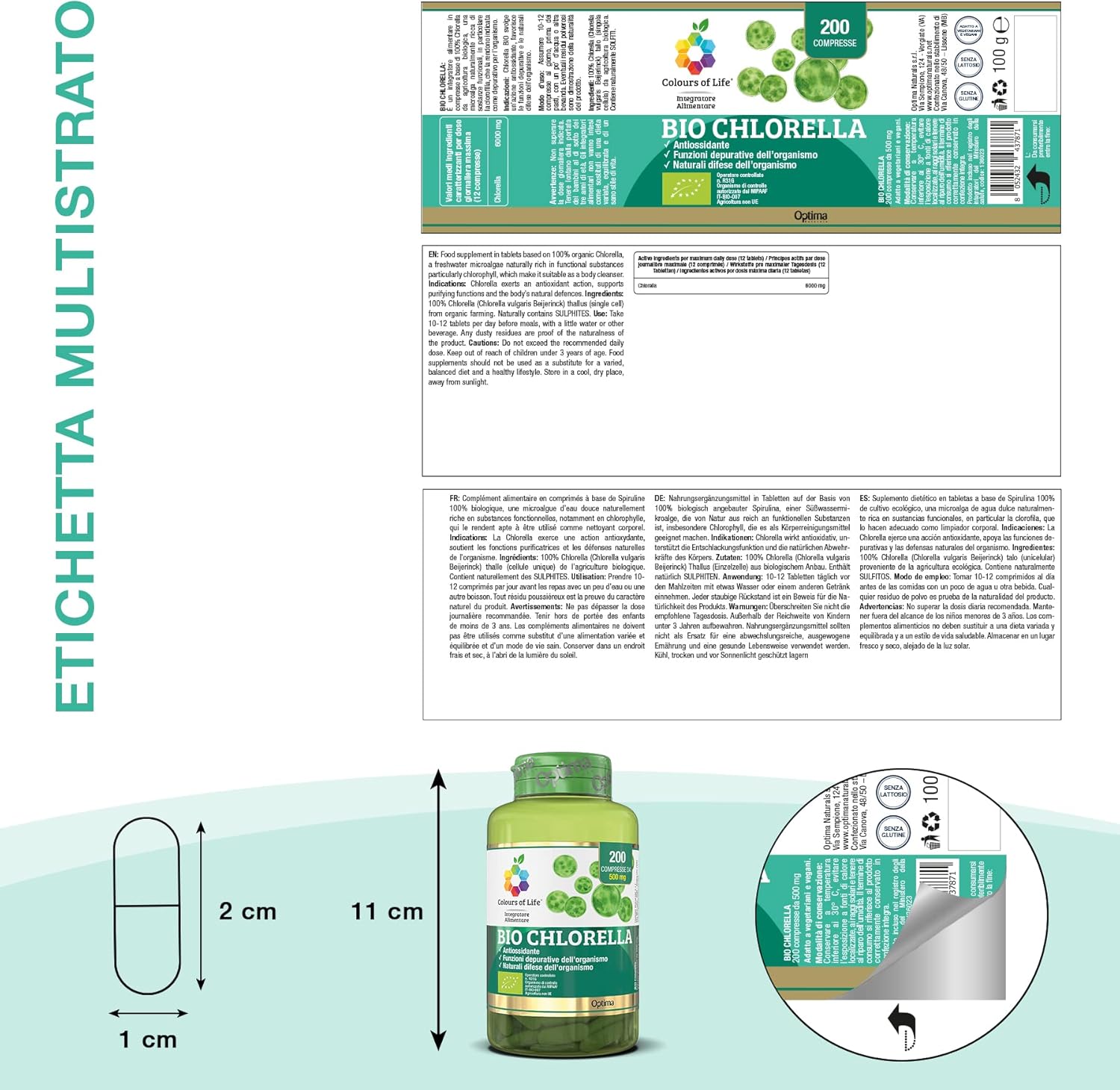 Contains 200 tablets of 500 mg. Maximum daily dose: 12 tablets; gluten-free.