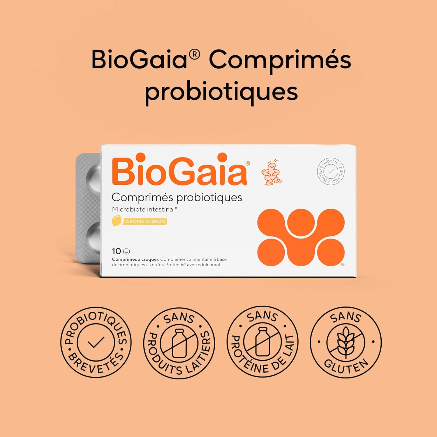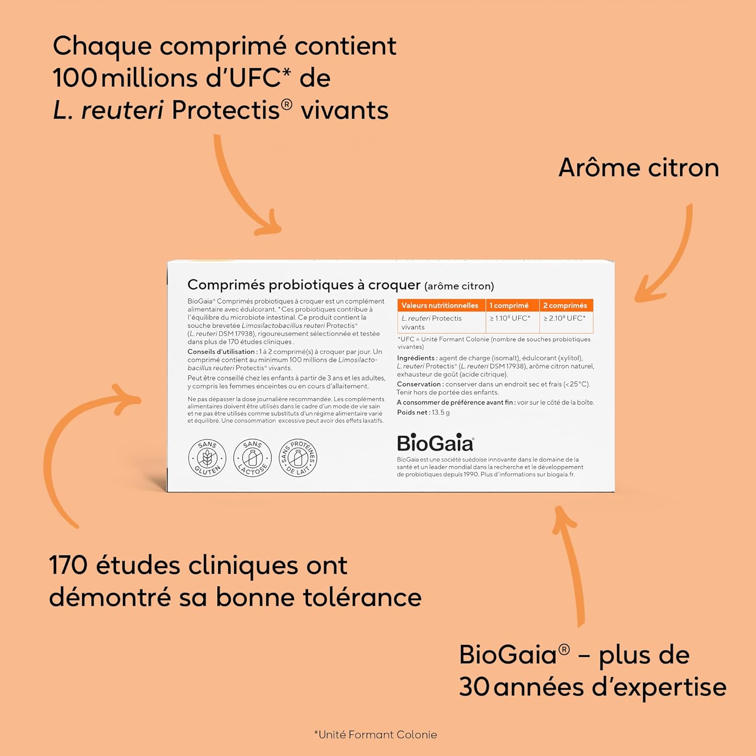 BioGaia Probiotic tablets lemon aroma is a dietary supplement formulated to participate in the balance of intestinal flora. It comes in the form of a chewable tablet. Each tablet provides 100 million CFUs of Limosilactobacillus reuteri Protectis, a patented probiotic strain that has been rigorously selected and tested in more than 170 clinical studies. Easy to take at any time of the day, 1-2 times a day. Suitable for children from 3 years and adults, including pregnant or breastfeeding women.