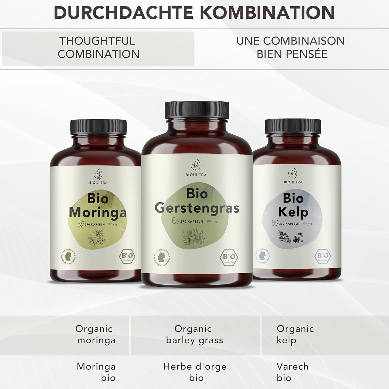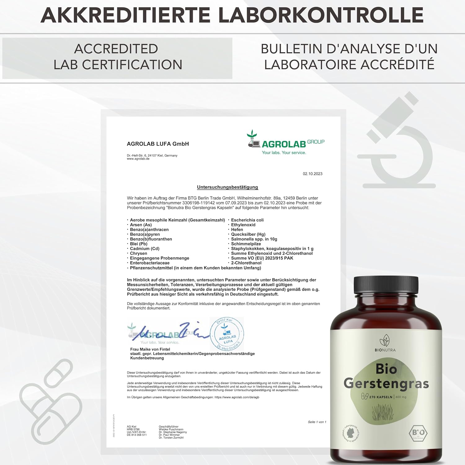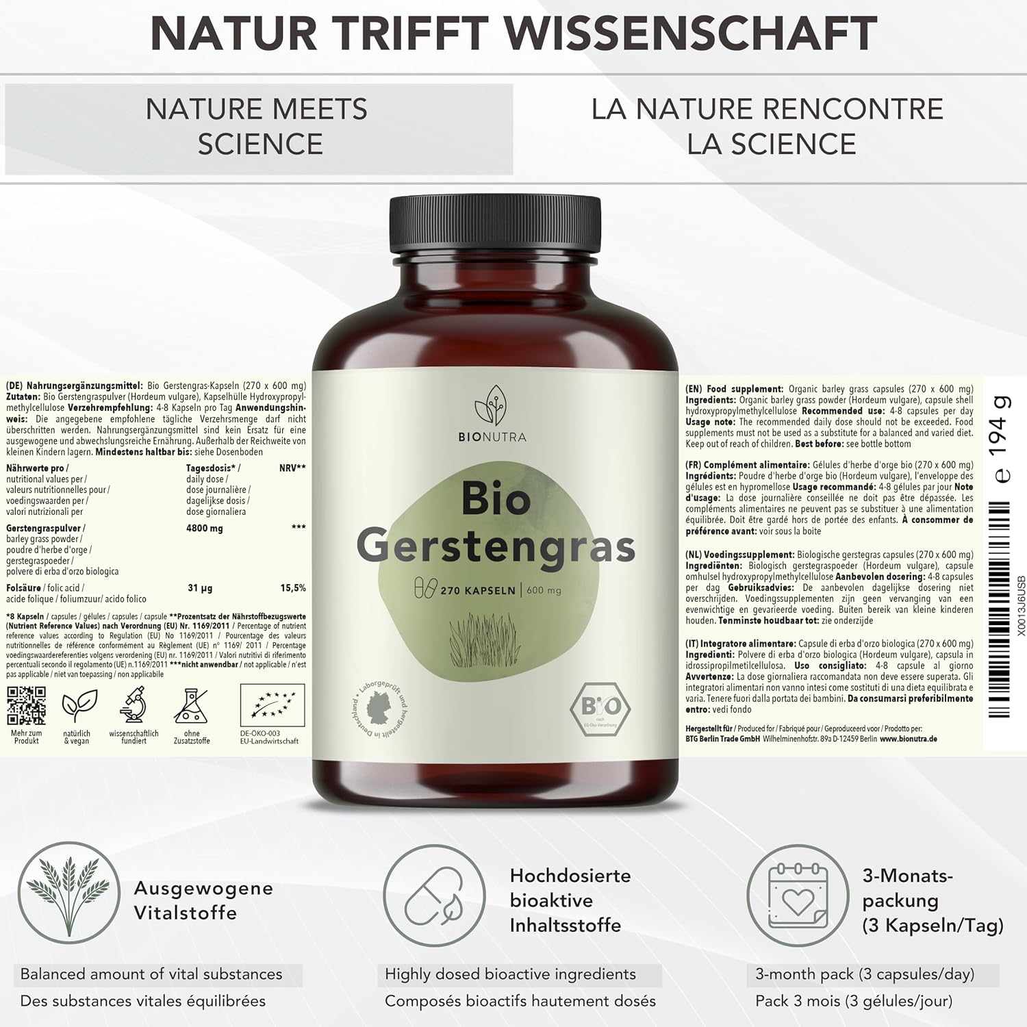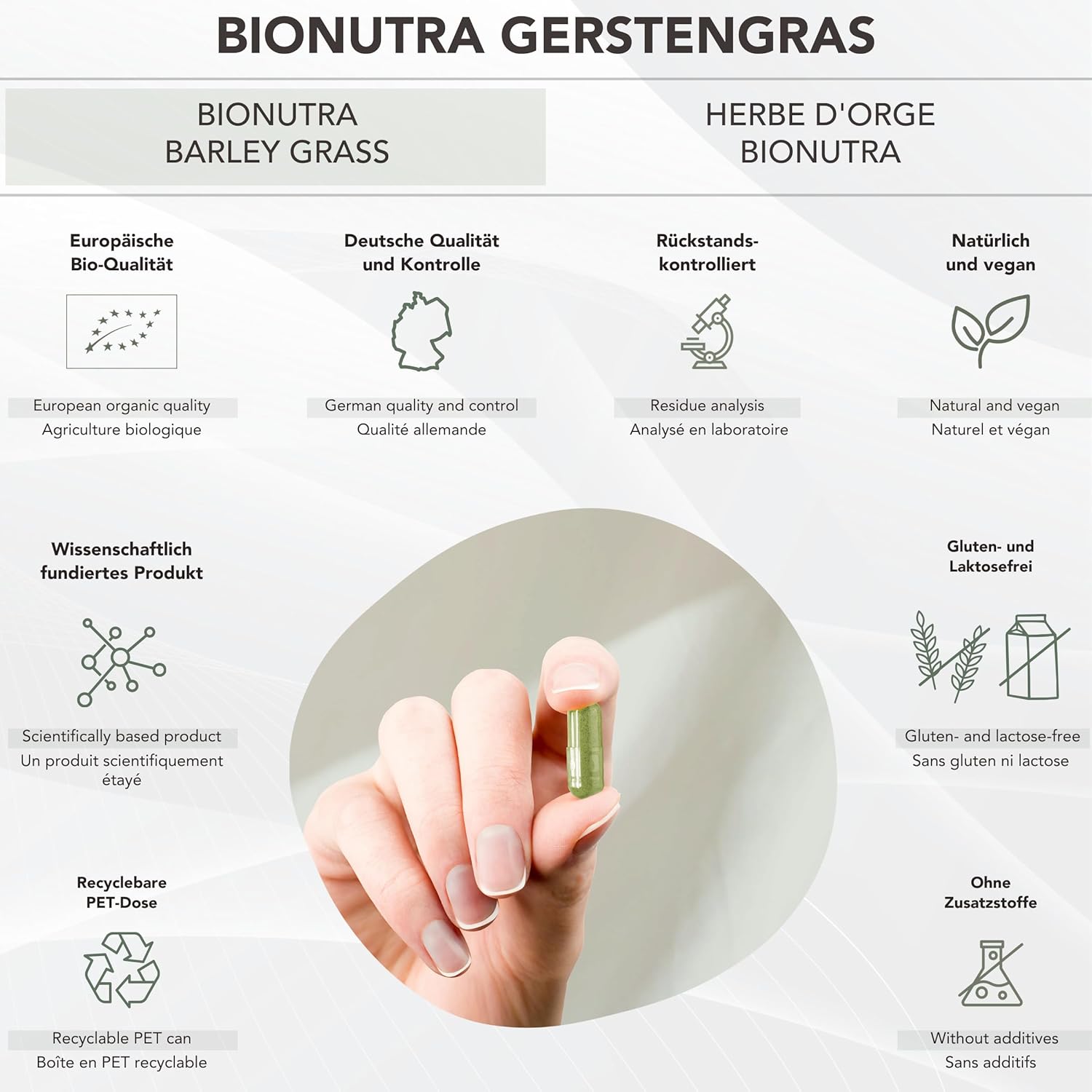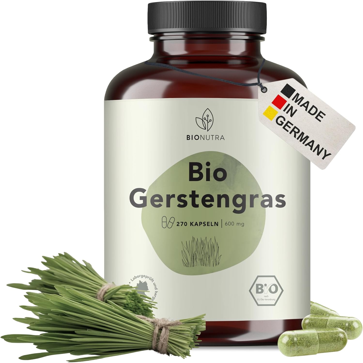BIONUTRA® High Dosed Organic Barley Grass Capsules – 4800 mg/day, 270 Capsules, Vegan, No Additives, Pure Powder, Made in Germany