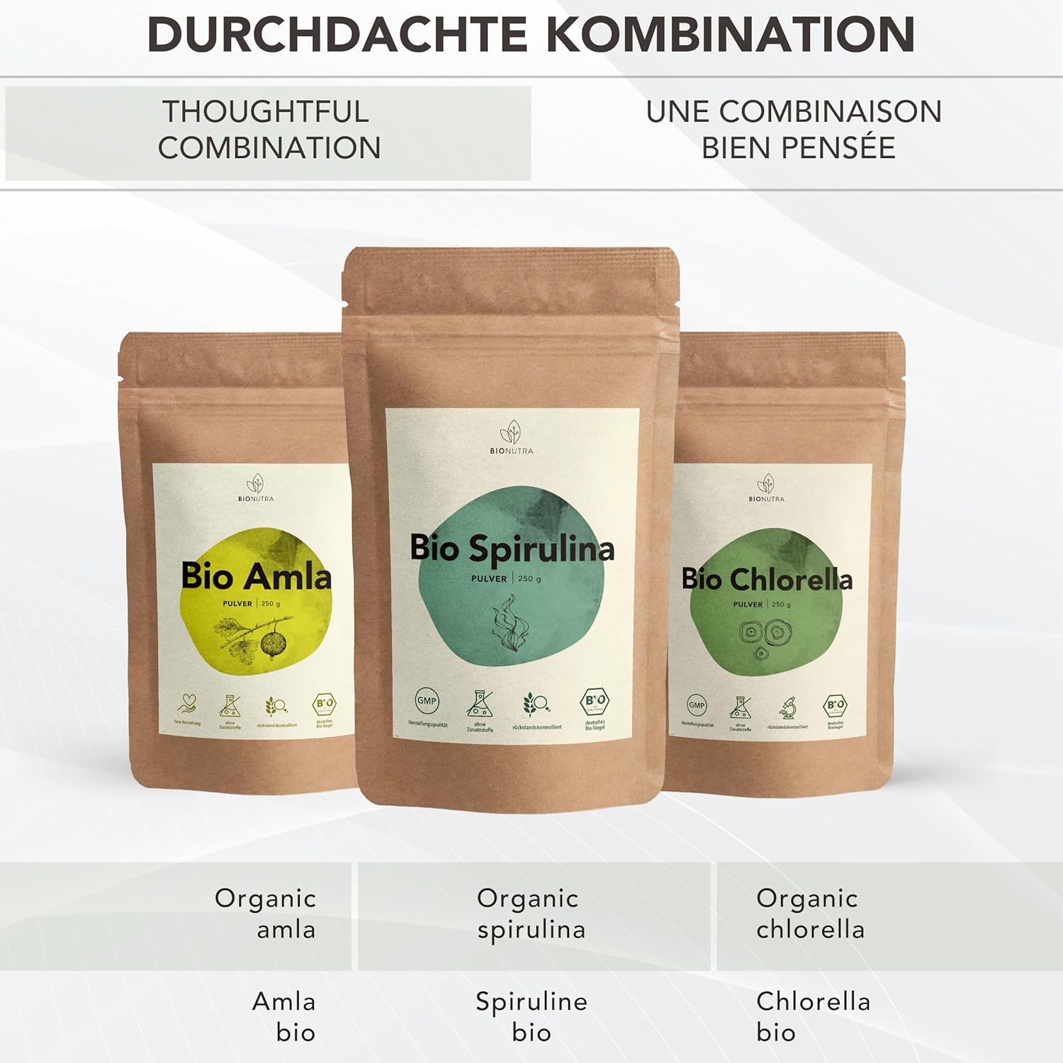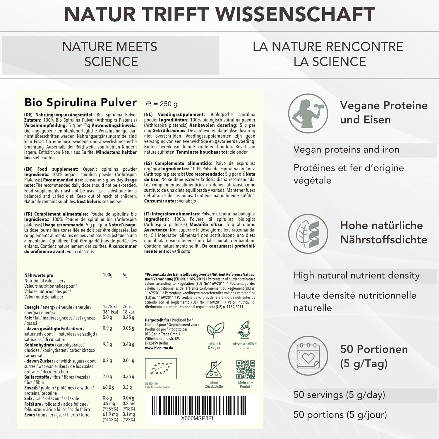 BIONUTRA Spirulina Bio Powder 250 g, tested for residues, laboratory tested, produced according to EU organic regulations, vegan, lactose free & gluten free, no additives, pure organic spirulina