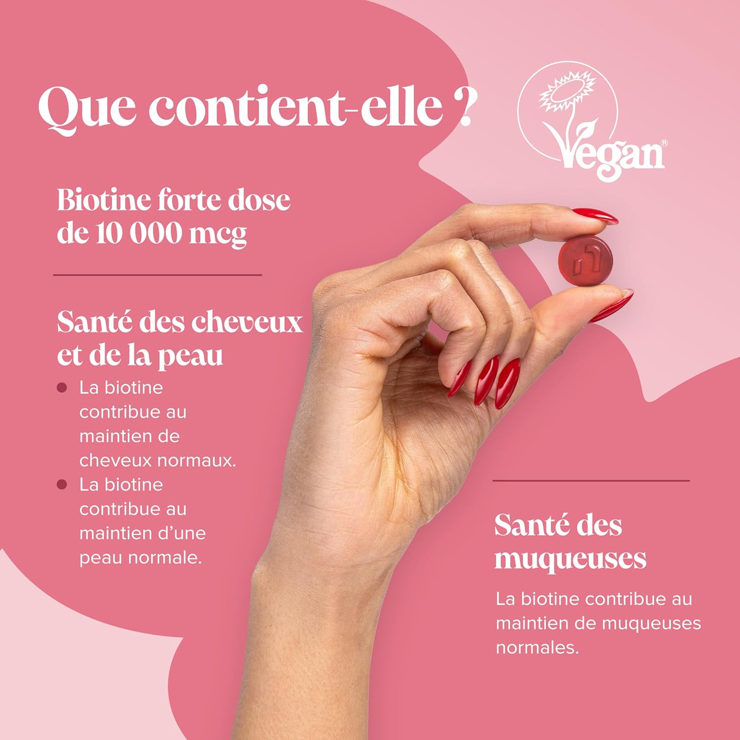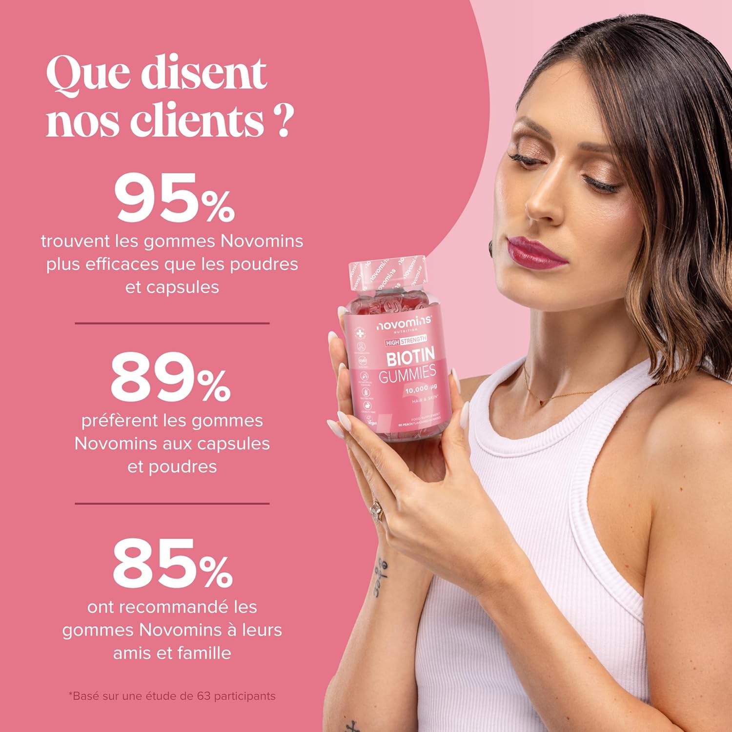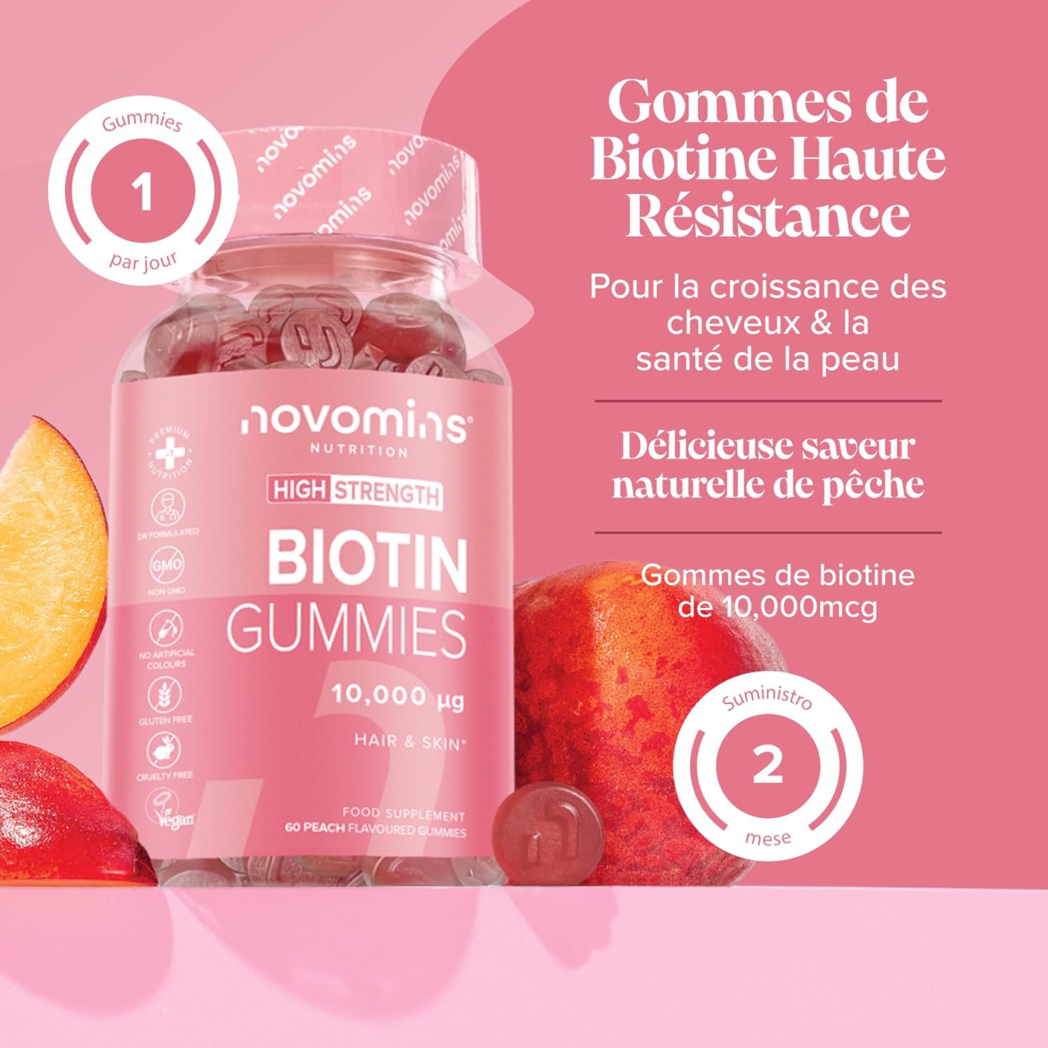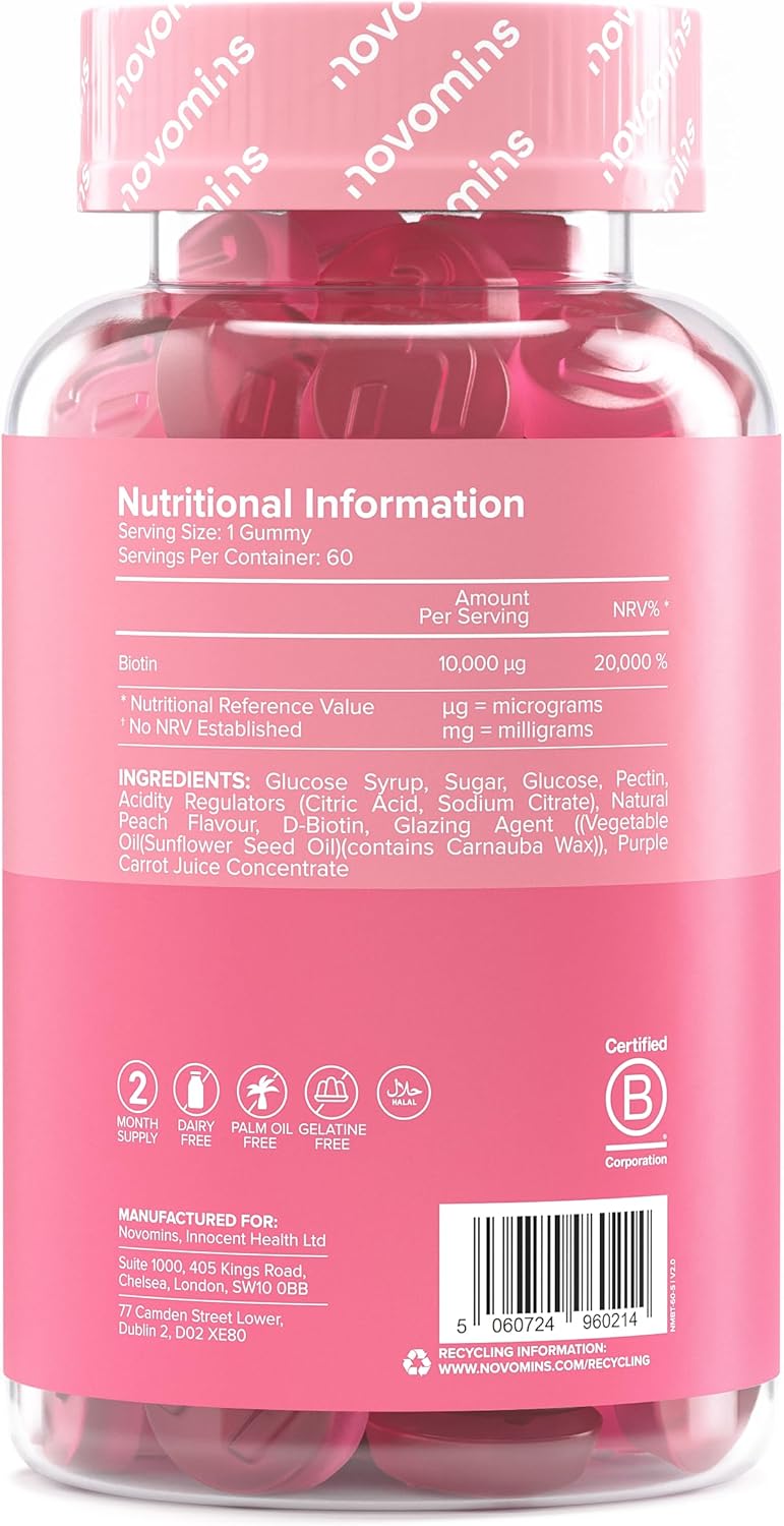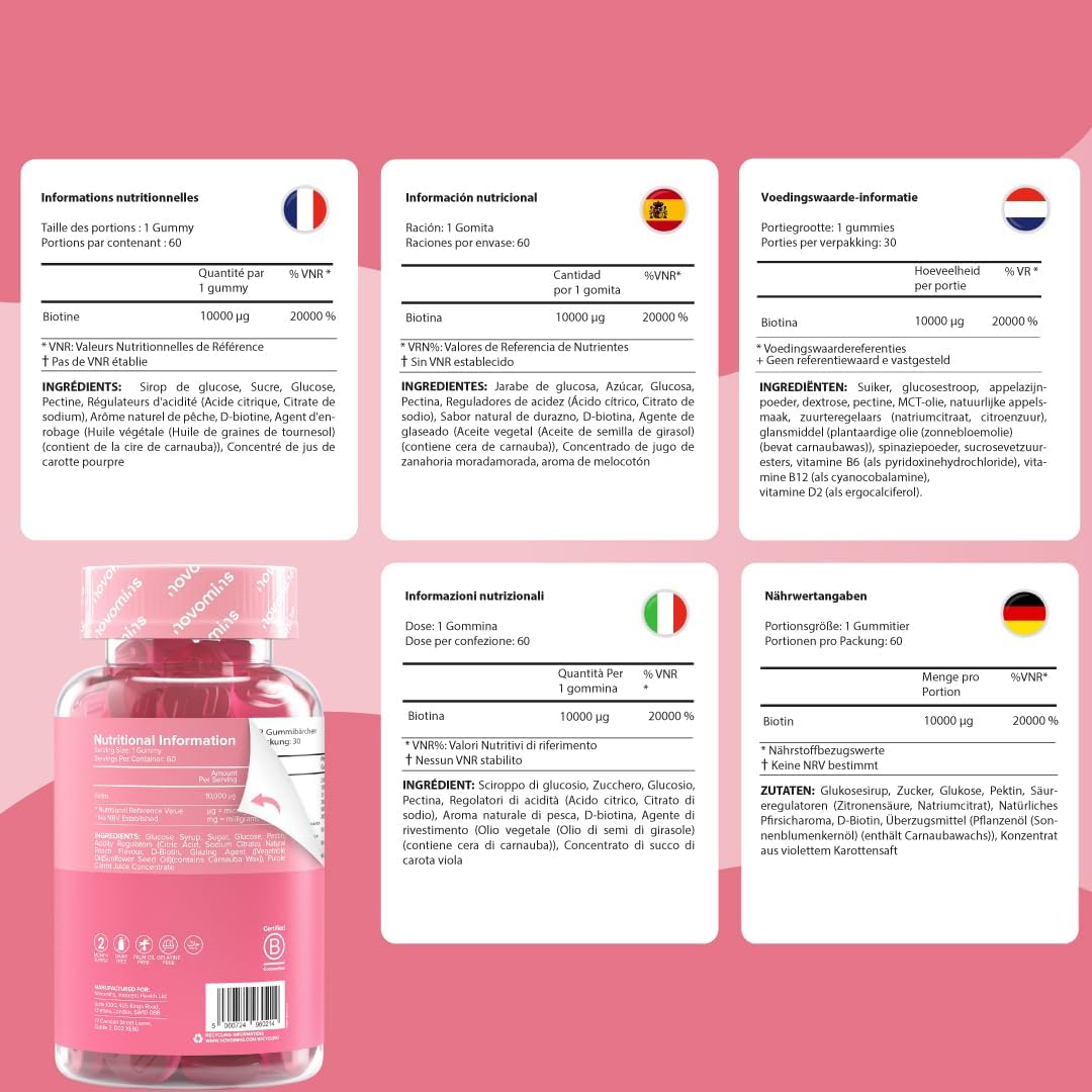 Anti-hair loss for women – Biotin for hair contributes to the normal maintenance of hair, skin and nails (EFSA). Our premium hair vitamins are formulated without artificial colors or preservatives, to care for your hair without harmful ingredients. In case of hair loss, thinning hair, or if you simply want to stimulate growth, Novomins gummies are an ideal solution for women hair loss.