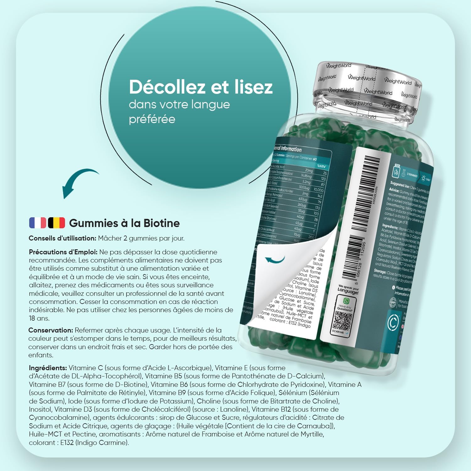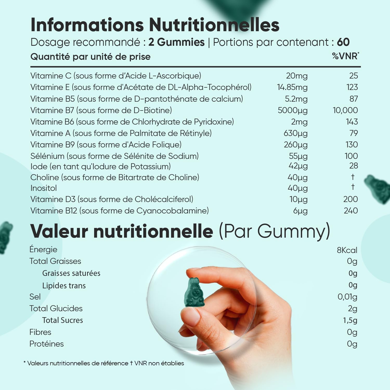 Delicious biotin gummies – Biotin gummies for hair, skin, nails, with a delicious taste of mixed berries, are with multivitamin and minerals. Each gummy is composed of D-Biotin (Vitamin B7) and 12 essential nutrients such as selenium, folic acid (vitamin B9), inositol, vitamin C, vitamin E, choline, iodine, and more.