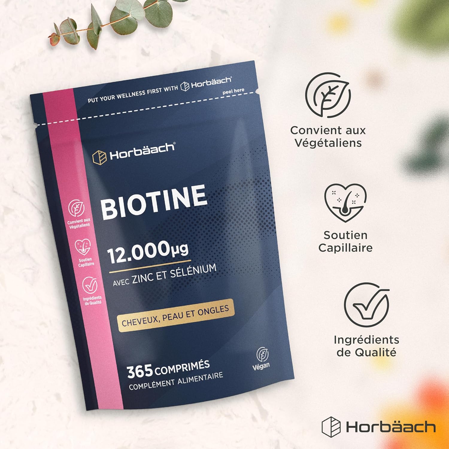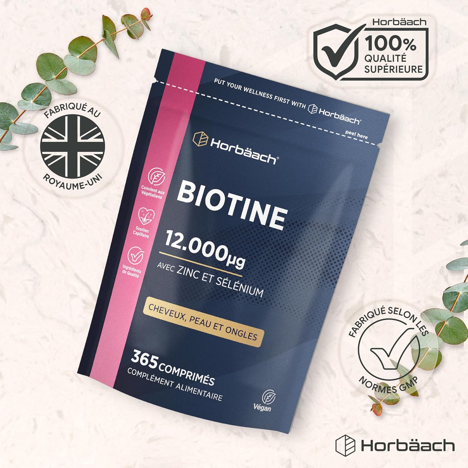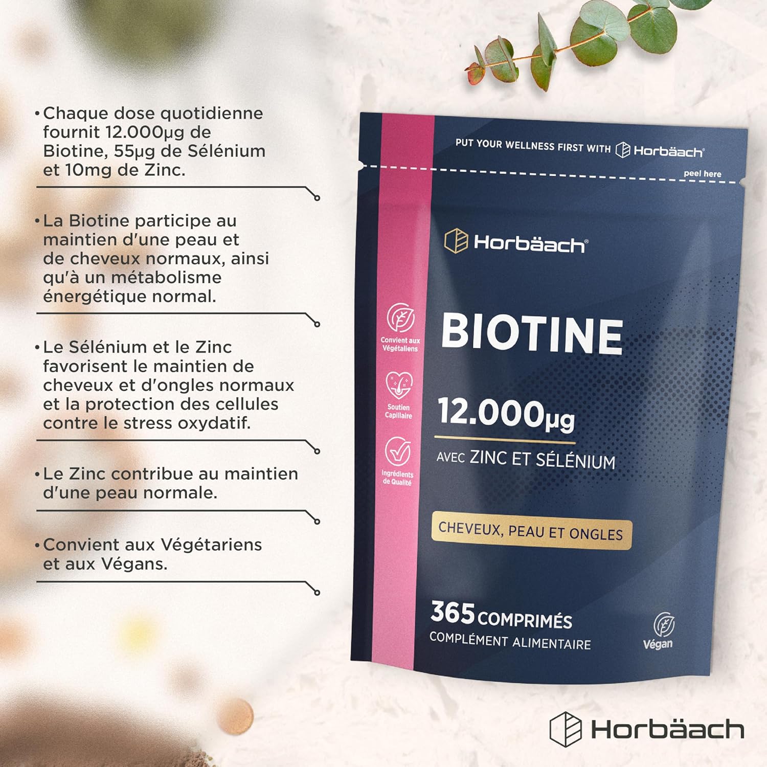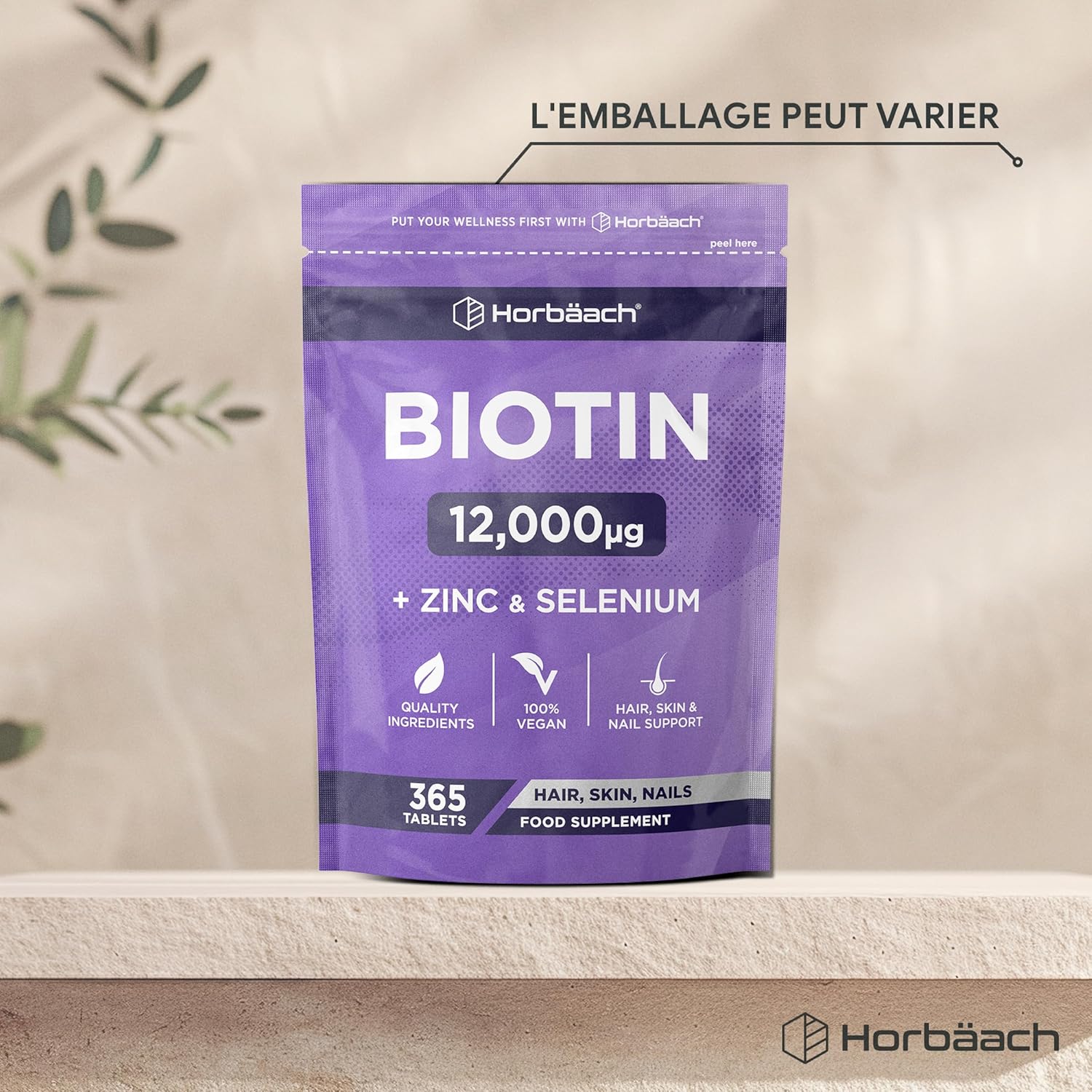 Biotin 12000 mcg Extra Strong | 4000 mcg per Tablets | 365 Vegan Tablets | Complex with Zinc and Selenium | Nutritional Supplement For Hair Skin Nails | Horbaach