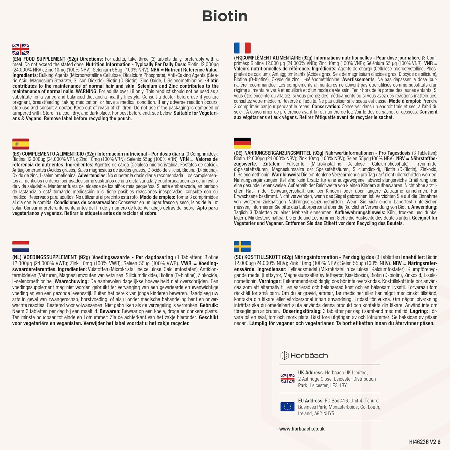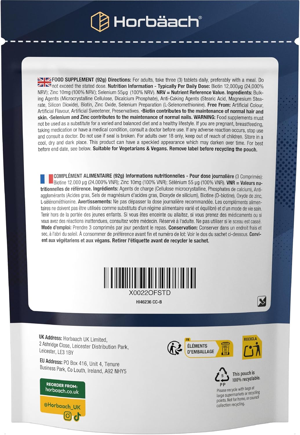 Boost your daily diet with Horbaach Biotin Complex tablets. This innovative formula provides 12,000 mg of biotin, 10 mg of zinc and 55 mcg of selenium per daily dose in ultra convenient tablets. Just take three tablets a day and enjoy the benefits of this supplement.