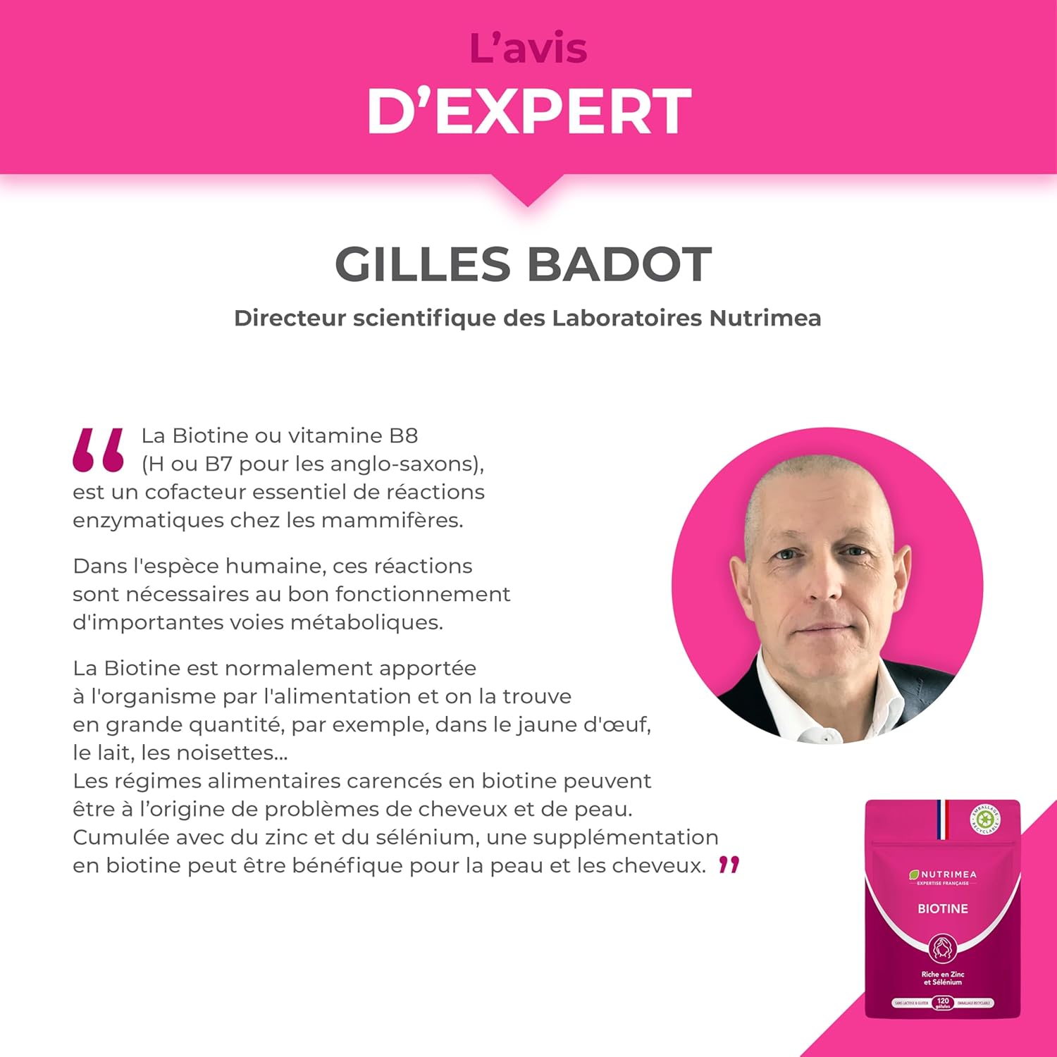 THE NUTRIMEA PROMISE ✦ Our formula is based on a rigorous selection of the best ingredients in order to offer you a more complete product that acts in depth. Our Biotin is made in the purest way possible: GMO-free, gluten-free and excipient-free. This product can be consumed after the date indicated on the product.