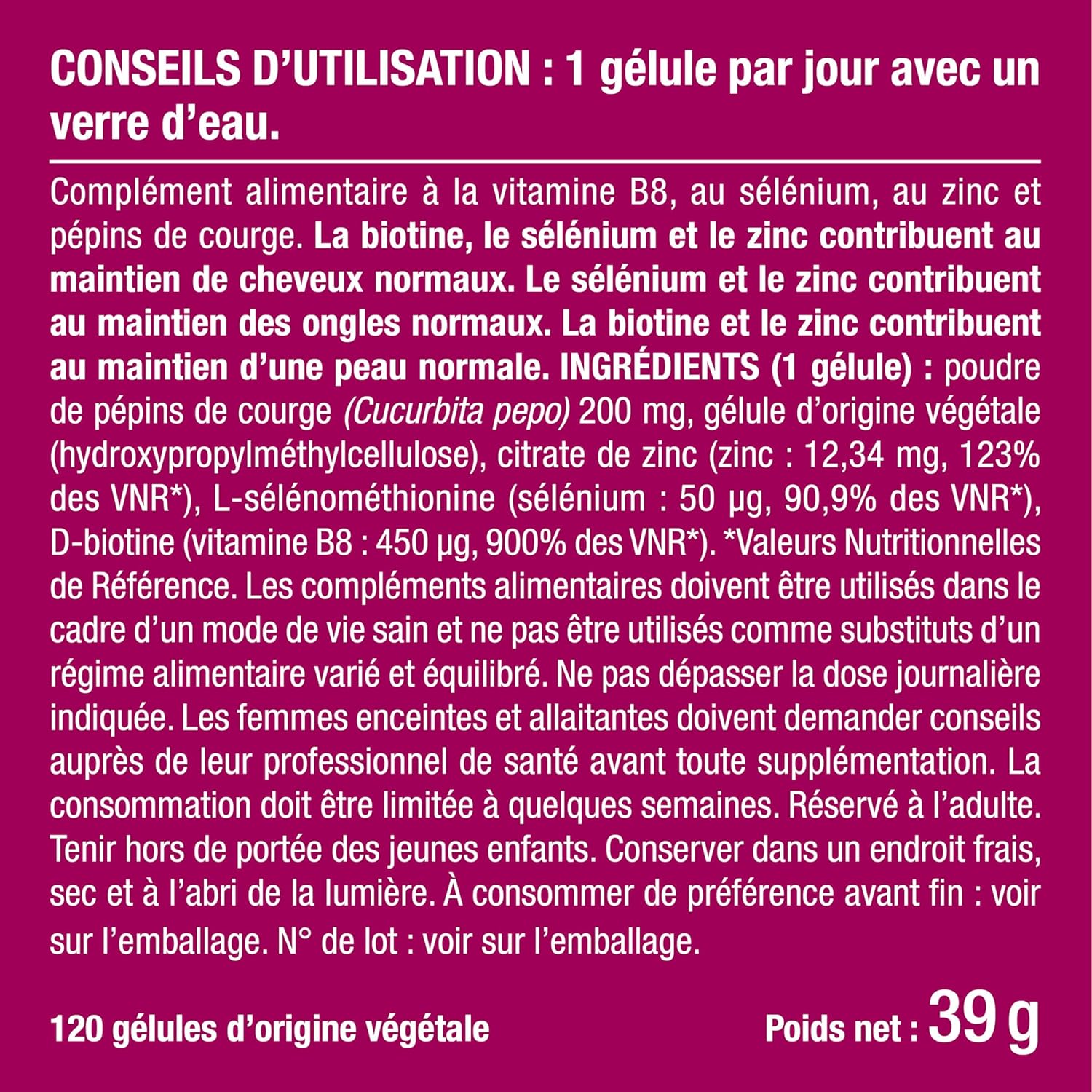 NEW FORMULA WITHOUT EXCIPIENT ✦ For even more visible effects, our Biotin is now enriched with pumpkin seeds, a natural active ingredient known to limit hair loss and restore shine! To benefit from an optimal result, we recommend a course of 4 months.