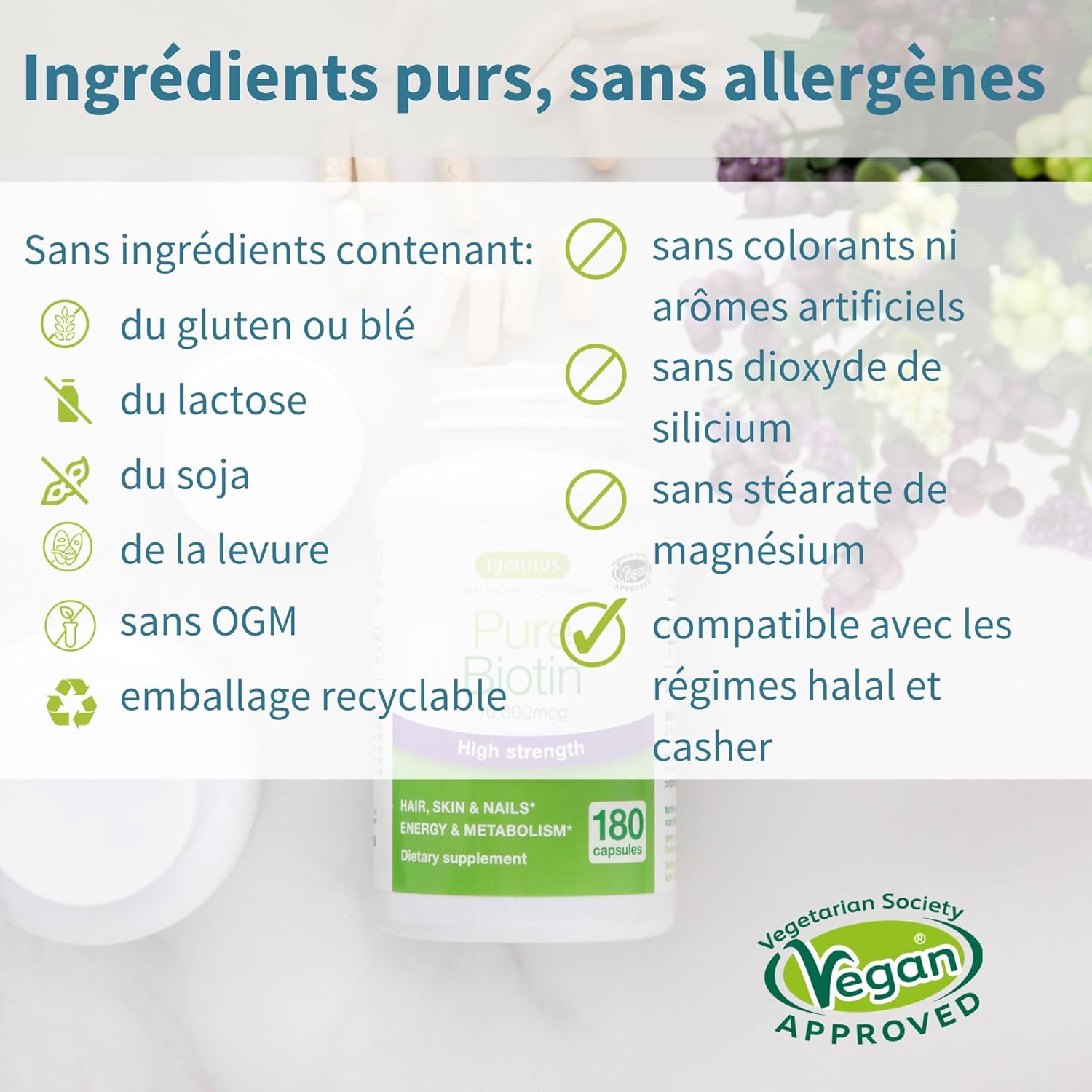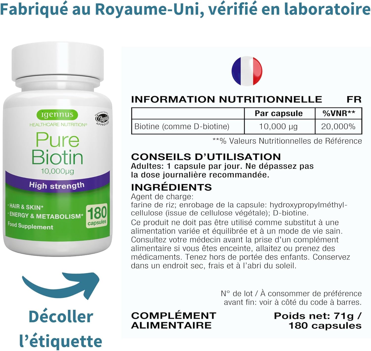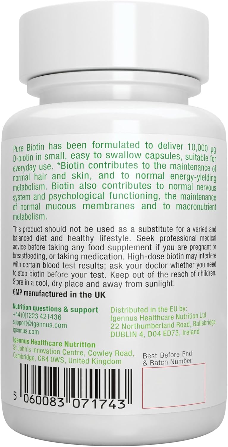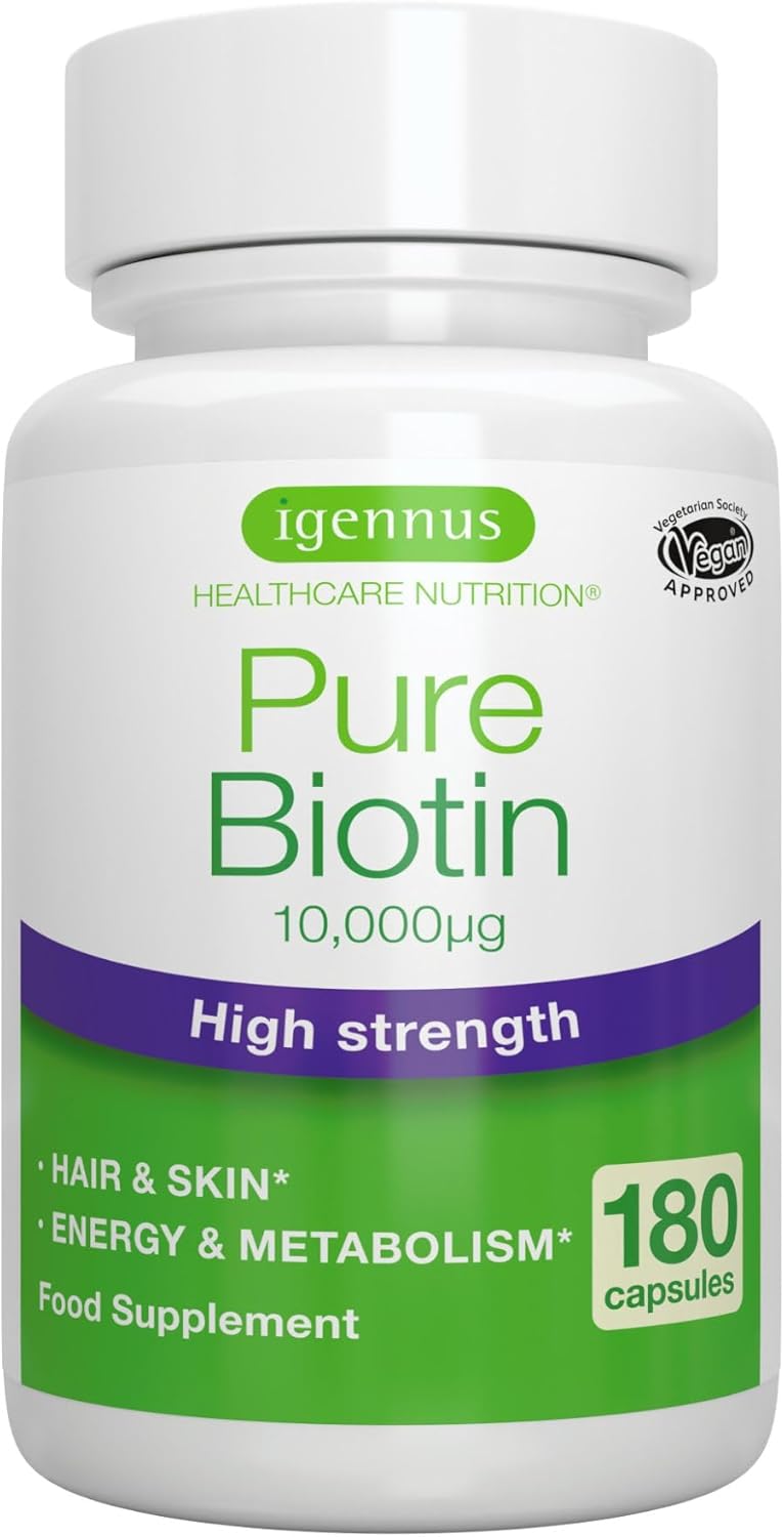 Biotin Pure 10,000 mcg, D-Biotin, 1 Daily, 180 Capsules, Lab Checked, Vegan & No Additives, Hair Growth, Skin & Energy Supplement by Igennus