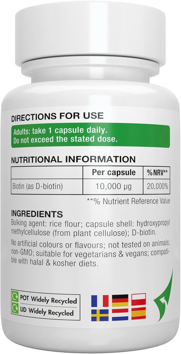 One-by-day – each bottle provides 180 capsules, which represents 6 months of supply at a recommended daily dose of 1 capsule. 10,000 mcg of biotin is the ideal dose for energy metabolism