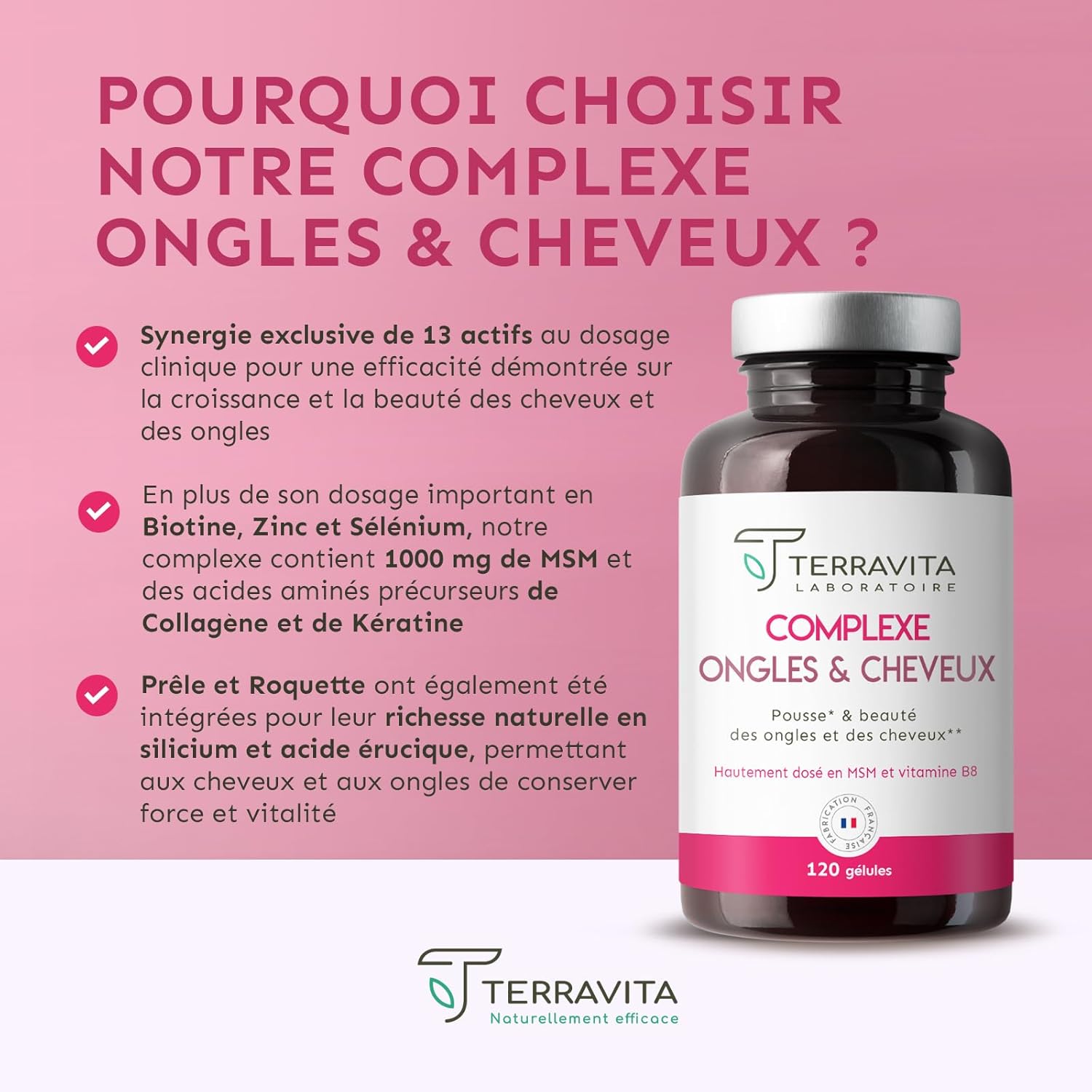 BIOTIN | Zinc + Selenium + MSM | Hair and Nail Growth | Exclusive Formula with Vitamins, Plants and Collagen Precursors | 120 Capsules without Excipients | Made in France Terravita