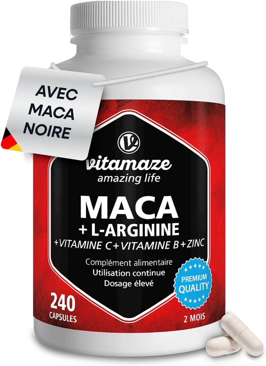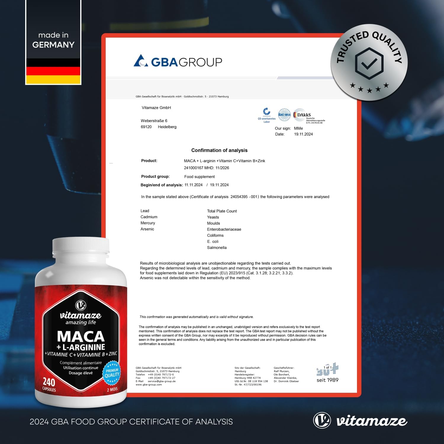 Black Maca Complex with L-Arginine 450mg, Three Types of Maca Andean (Black, Yellow and Red) + Vitamins C and B + Zinc, 240 Capsules, Andean Peruvian Root, German Quality, Vitamaze