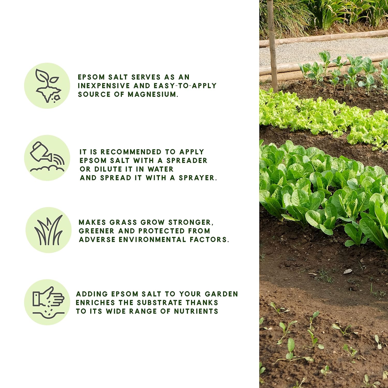 The Green Lawn- Epsom salt is ideal for having a green lawn. To enjoy its benefits, apply 1.5 kg of Epsom salt on a plot of 25 m². This treatment is preferably applied in the spring.