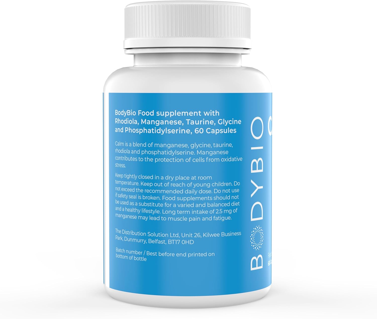 BodyBio Calm Rhodiola Rosea, Glycine & Phosphatidylserine – Stress Management Without Drowsiness – Relaxation & Concentration – Natural Vegan & Gluten Free Formula – 60 Capsules