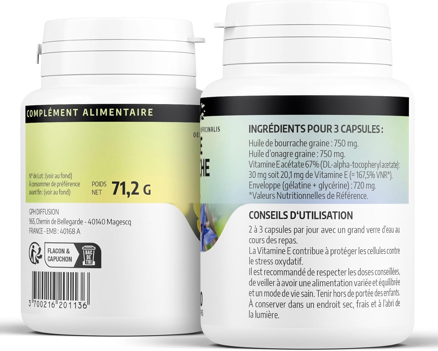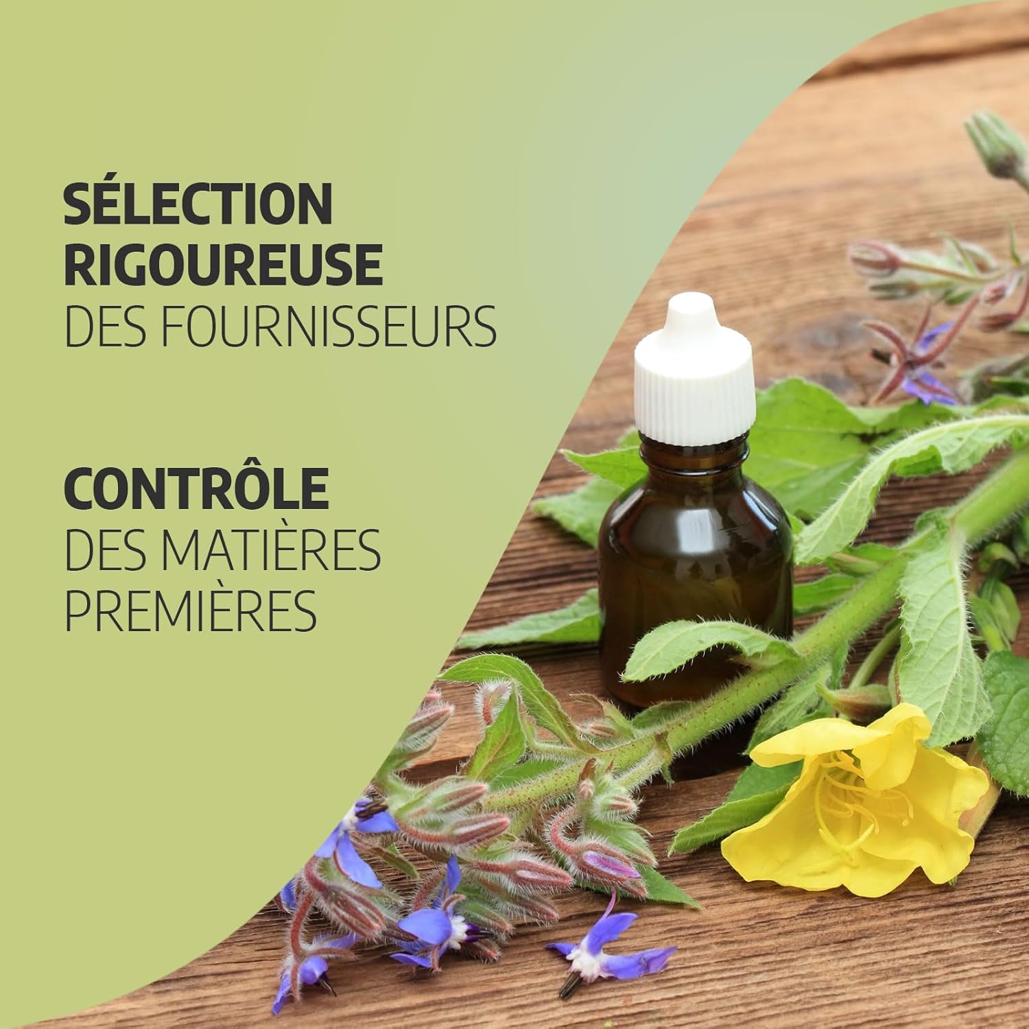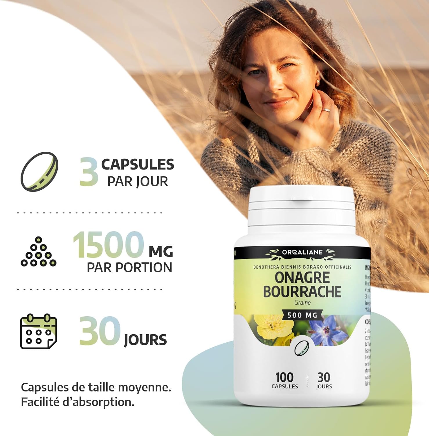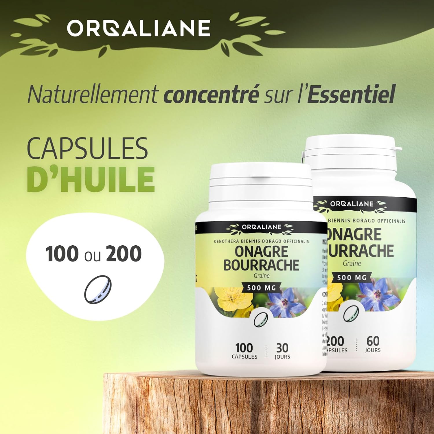 Les huiles de Bourrache et d’Onagre peuvent être consommées lors de complémentations. En optant pour cette formule, vous bénéficiez des propriétés des plantes sur la durée. Les capsules sont faciles à utiliser, elles vous permettent d’obtenir le bon dosage journalier en une seule prise. Vous pouvez prendre cette complémentation lors de votre repas du midi, avec un simple verre d’eau. Pour ce qui est de la durée de la complémentation, celle-ci peut varier entre 10 et 30 jours selon l’effet souhaité. Il est possible de faire une supplémentation de 3 mois maximum (à réitérer sur l’année si nécessaire).