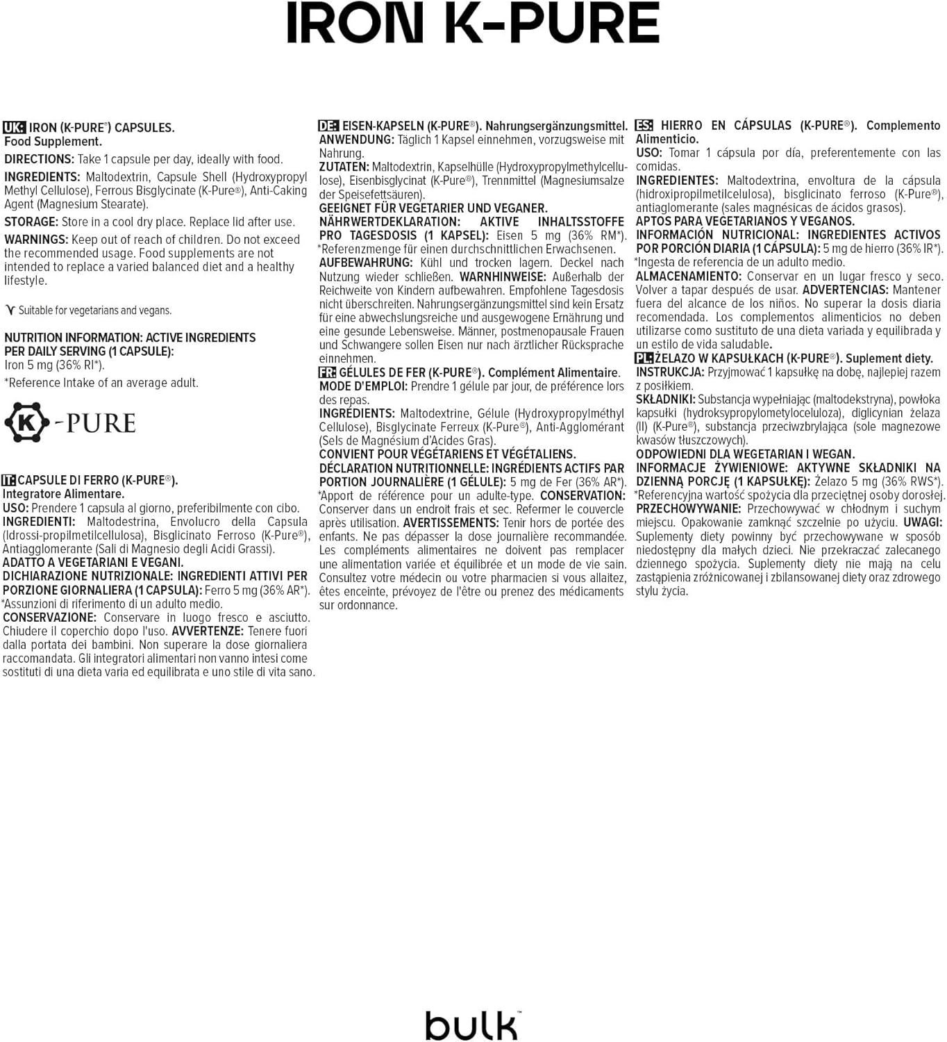 WHAT ARE 20 MG IRON CAPSULES (K-PURE)? BULK POWDERS 20 mg iron capsules (K-Pure) contain a highly bioavailable source of iron, ferrous bisglycinate. The absorption of ferrous bisglycinate is higher than that of ferrous oxide and other cheaper forms of iron. Ferrous bisglycinate is often referred to as “soft iron”. BULK POWDERS has carefully selected K-Pure Ferrous Bisglycinate because we believe it is of the highest quality. K-Pure is one of the world’s leading suppliers of the best minerals, using the latest technologies to ensure that the quality and, above all, absorption is far superior to those of cheaper alternatives. The 20mg iron capsules (K-Pure) have been developed in a pharmaceutical grade spray dryer, making it a premium iron source specially formulated to increase mineral stability. A more stable product increases the bioavailability of iron, as iron does not compete with other nutrients for absorption. Simply, K-Pure ferrous bisglycinate is a form of iron that is more easily absorbed by the body. WHAT IS IN 20 MG IRON CAPSULES (K-PURE)? A key attribute of 20 mg iron capsules (K-Pure) is that ferrous bisglycinate was used as a source of iron. Ferrous bisglycinate is a premium source of iron and is superior to cheaper alternatives. Ferrous bisglycinate has an iron content of 24%, but its superior absorption makes it the equivalent of much higher amounts of inferior iron sources. WHO ARE 20 MG IRON CAPSULES (K-PURE) SUITABLE FOR? Iron is an essential mineral that plays many important roles in the body, including contributing to the reduction of exhaustion and fatigue, the normal functioning of the immune system, the normal transport of oxygen in the body, normal cognitive function and normal energy metabolism. 20 mg iron capsules (K-Pure) can be used by anyone who does not consume enough iron in their daily diet. Women and people suffering from anemia are most exposed to low iron levels. OUR QUALITY Like all Pure Series products, this product comes directly from an authorized supplier BULK POWDERS. All our suppliers undergo rigorous audits to ensure they meet our high standards and we regularly test products as part of our internal quality control procedures. We only work with a small number of carefully selected suppliers, with whom we have partnered with for the most part since the launch of BULK POWDERS in 2005. In addition, all Pure Series products are packaged in our own state-of-the-art production facility, which is operated to a higher standard than our competitors. All of this combines to ensure that we only deliver the highest quality products at the lowest prices in the UK.