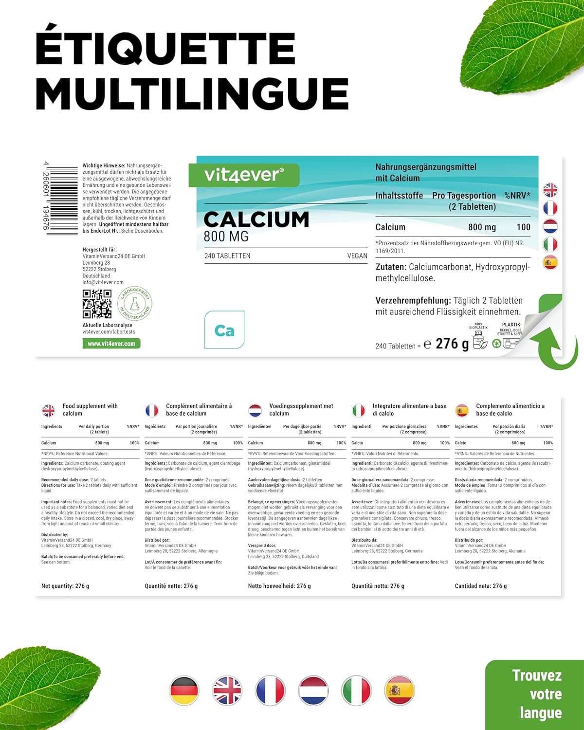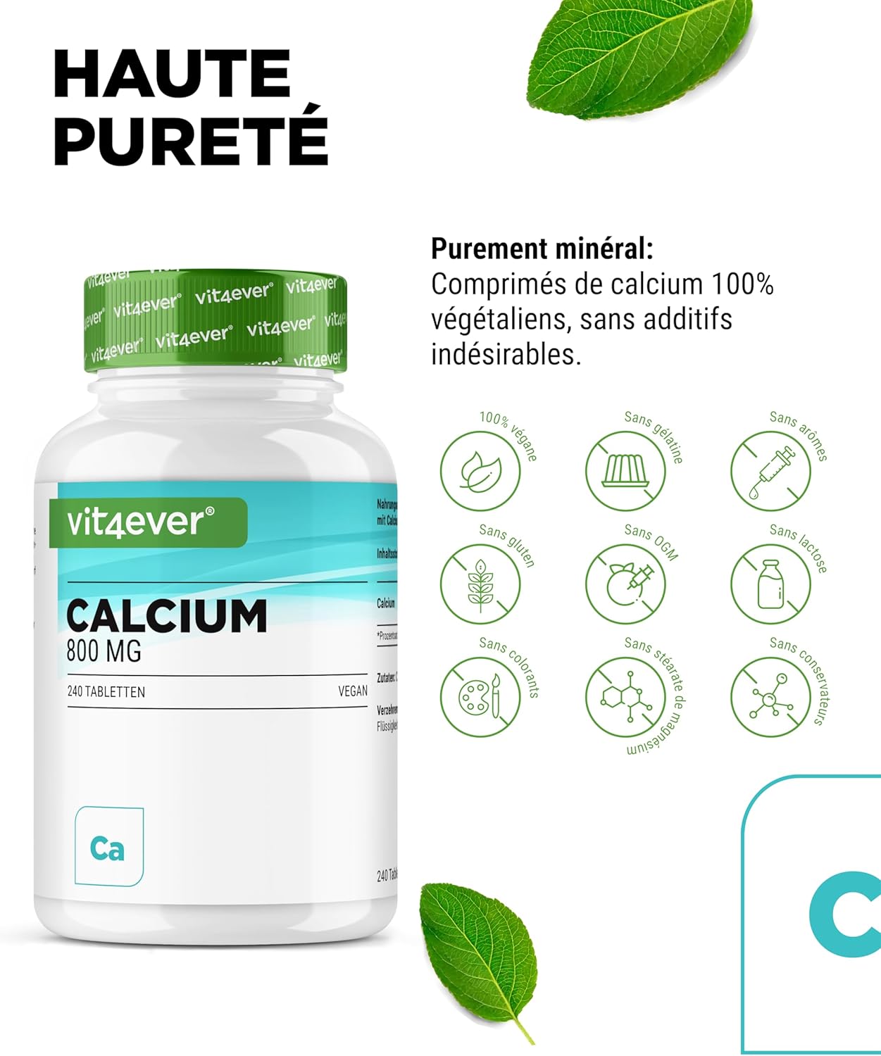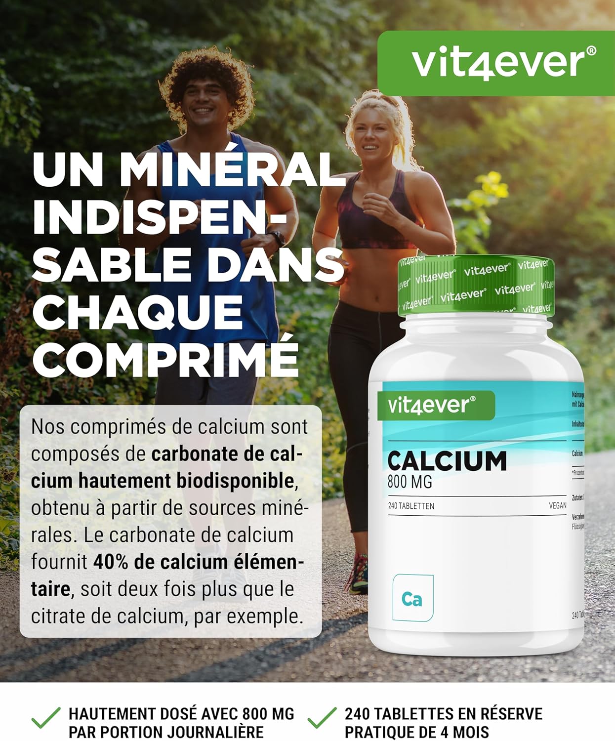 Calcium – 240 tablets – 800 mg of calcium from calcium carbonate per daily dose – For 4 months – Vegan, highly dosed & without unwanted additives