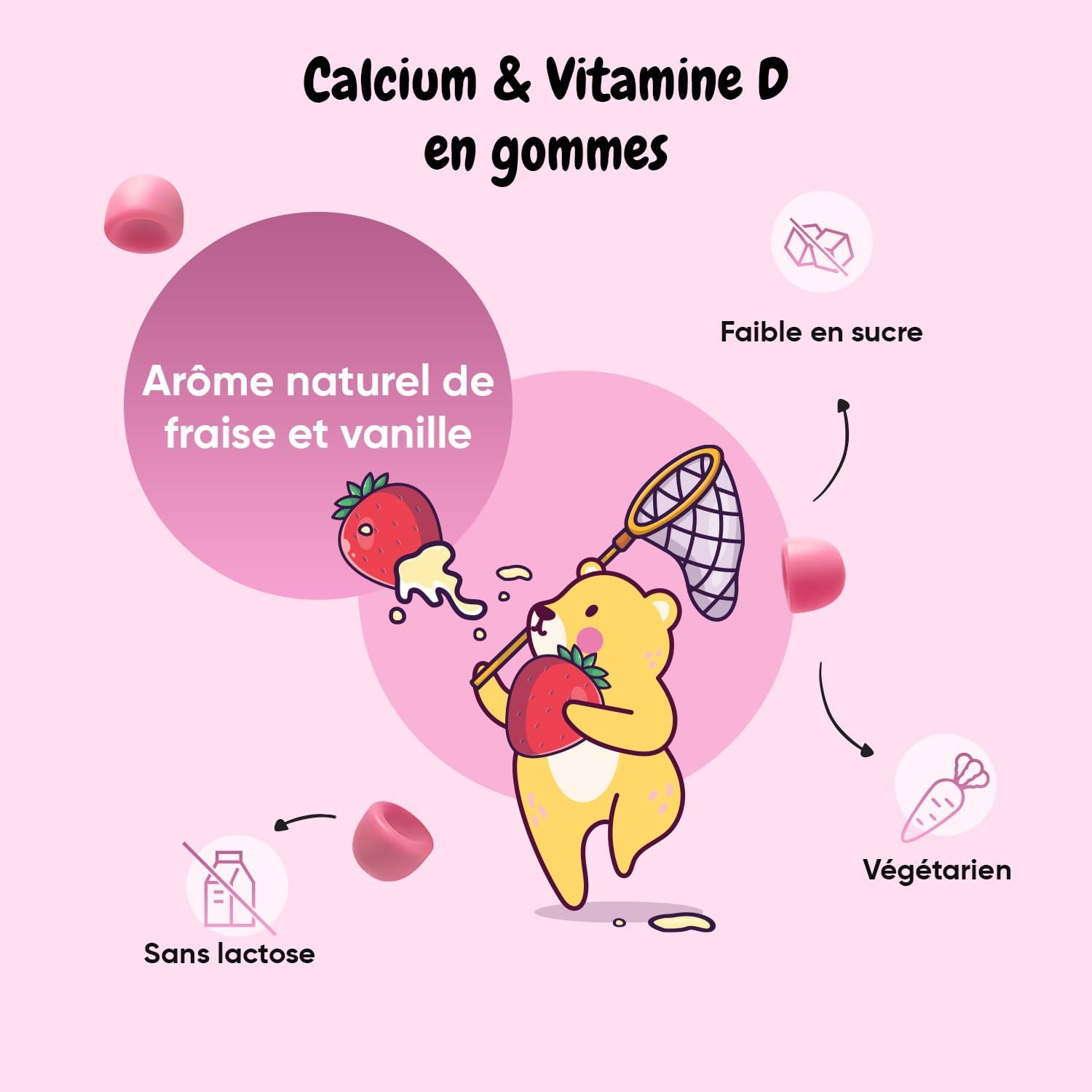 Calcium and Vitamin D Child Gummies, 90 Low Sugar Gummies, Child Vitamin 3 Years to 12 Years with Natural Strawberry and Vanilla Flavor, Vegetarian, Gluten and Lactose Free