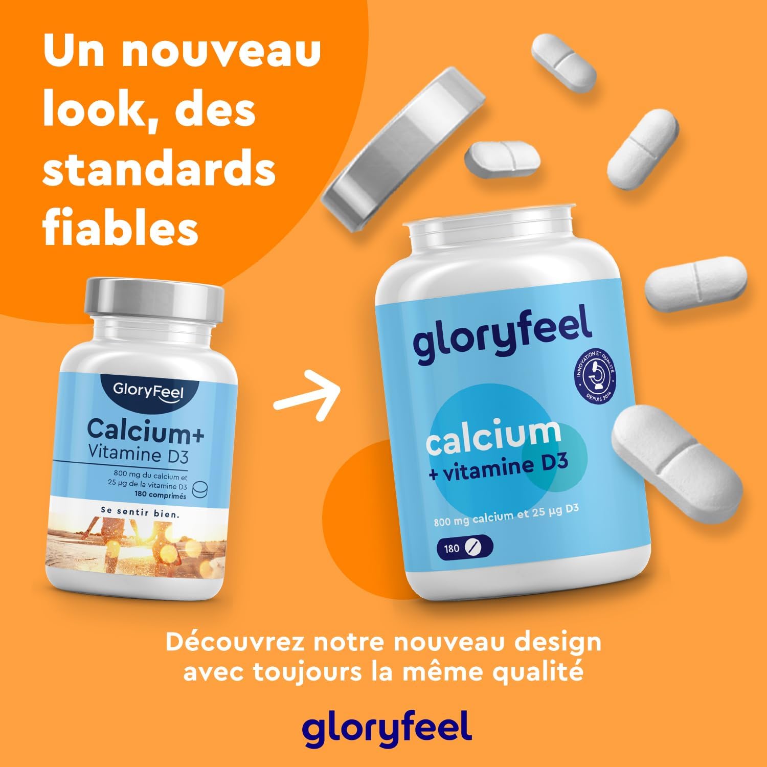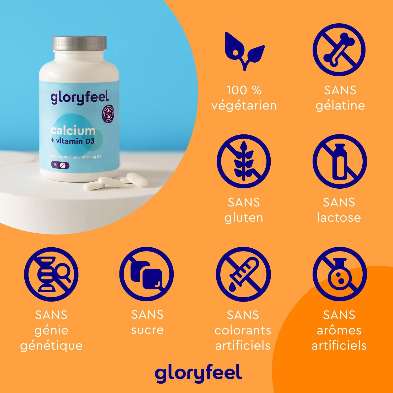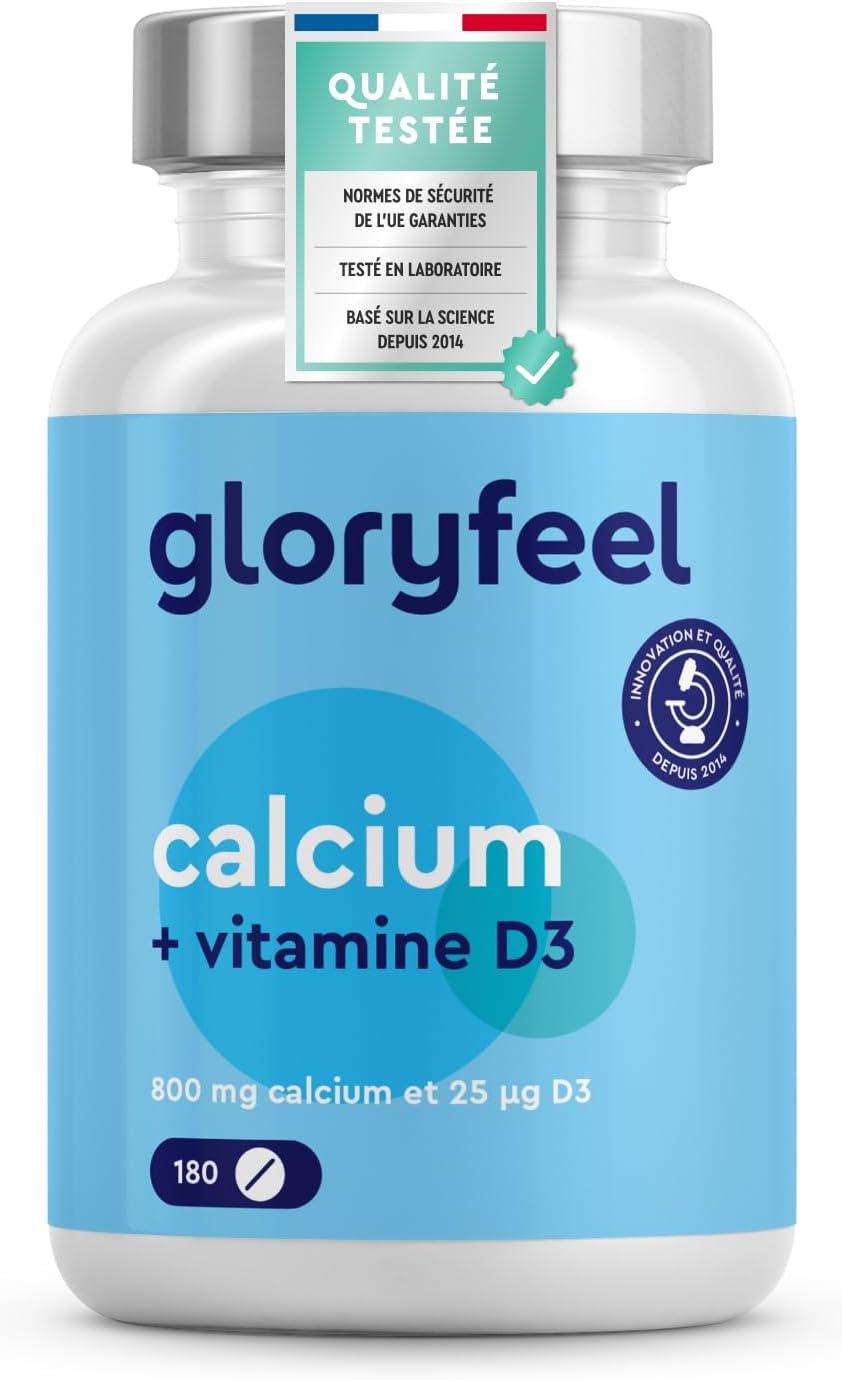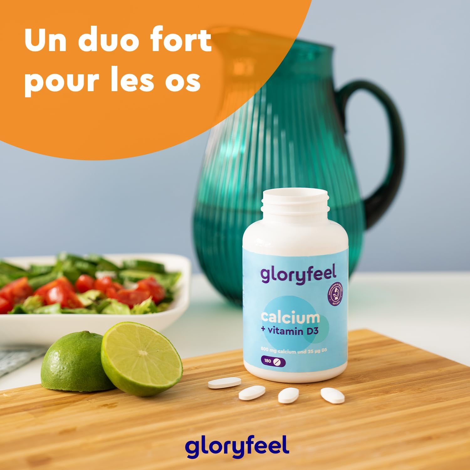 Bouteille blanche de suppléments de calcium et de vitamine D3 Gloryfeel sur une surface en bois à côté d'un saladier et d'un verre bleuBouteille blanche de suppléments de calcium et de vitamine D3 Gloryfeel sur une surface en bois à côté d'un saladier et d'un verre bleu