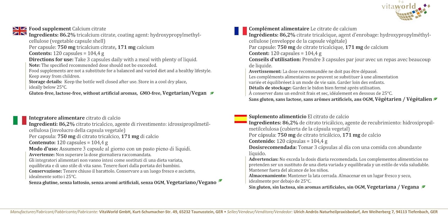 Calcium Citrate 500 120 Capsules Vegan For Healthy Bones – Calcium Citrate. Calcium plays an important role in bone development and other bodily functions that depend on an optimal supply of this important nutrient. Calcium is especially necessary for teeth and bones, as they consist mainly of calcium compounds. Calcium is also important for signal transmission between nerve cells as well as for normal muscle function and acid-base balance. It also plays an important role in blood clotting, as it is necessary to convert a blood clotting factor into its active form. Calcium in the form of tricalcium citrate has a high bioavailability and can therefore be absorbed very well by the body. Consume 3 capsules a day with a meal with plenty of fluid. Food supplement with calcium. Ingredients: 86.2% tricalcium citrate, coating agent: hydroxypropylmethylcellulose (shell of the vegetable capsule) NUTRIMENTS FOR 3 CAPSULES Tricalcium citrate 2250 mg of which calcium 513 mg 120 capsules = 104 g