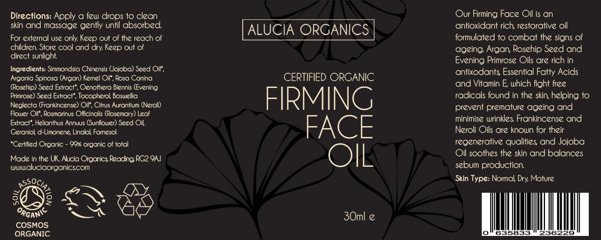 Our Organic Firming Facial Oil is an antioxidant-rich restorative oil formulated to combat the signs of aging. Organic Argan, Rosehip Seed and Evening Primrose seed oils are rich in antioxidants, essential fatty acids and vitamin E, which fight free radicals found in the skin, helping prevent premature aging and reduce wrinkles. Organic incense and neroli oils are known for their regenerative qualities, while organic jojoba oil soothes the skin and balances sebum production. All our products, as well as firming facial oil, are certified organic by COSMOS through the Soil Association. Our license number is CS24625. The Soil Association carries out an annual inspection of our company, ensuring the authenticity of our products.