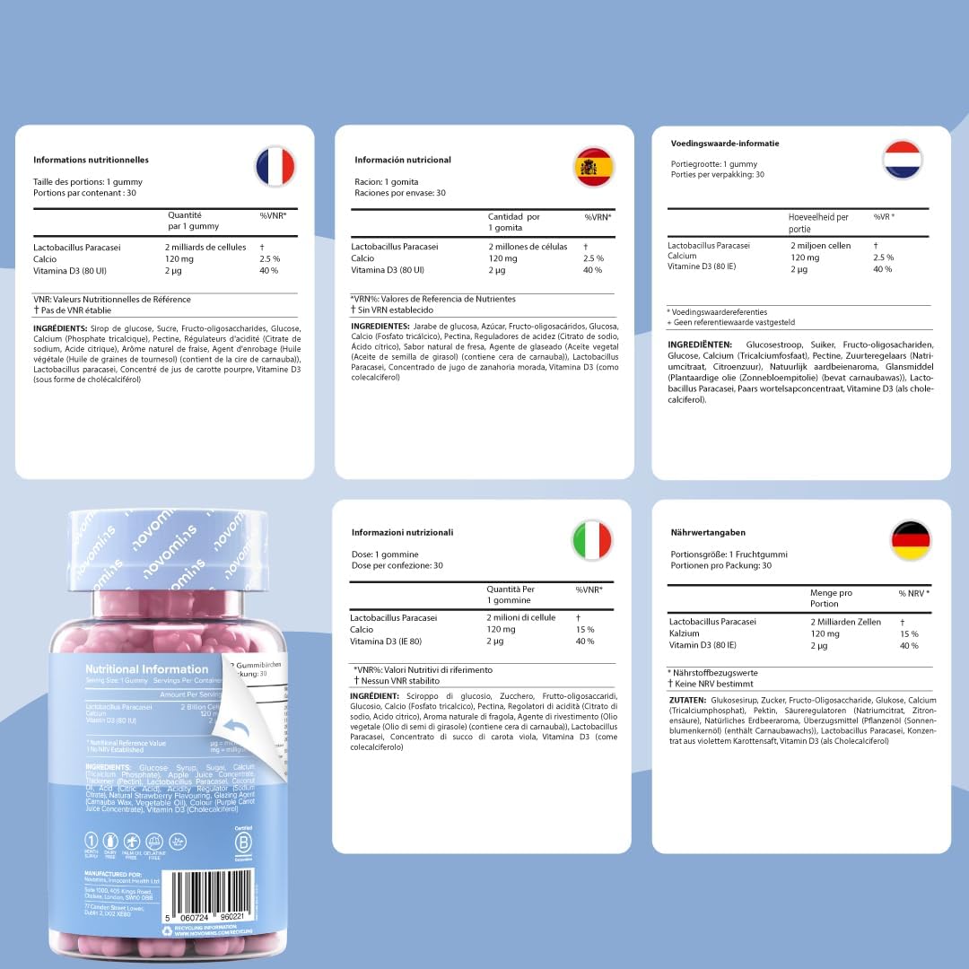 Children’s Probiotic Gums – Lactobacillus Paracasei + Vitamin D & Calcium – Digestion & Gut Flora – Vegan, Gluten Free, Gelatin Free – 30 Gums Novomins